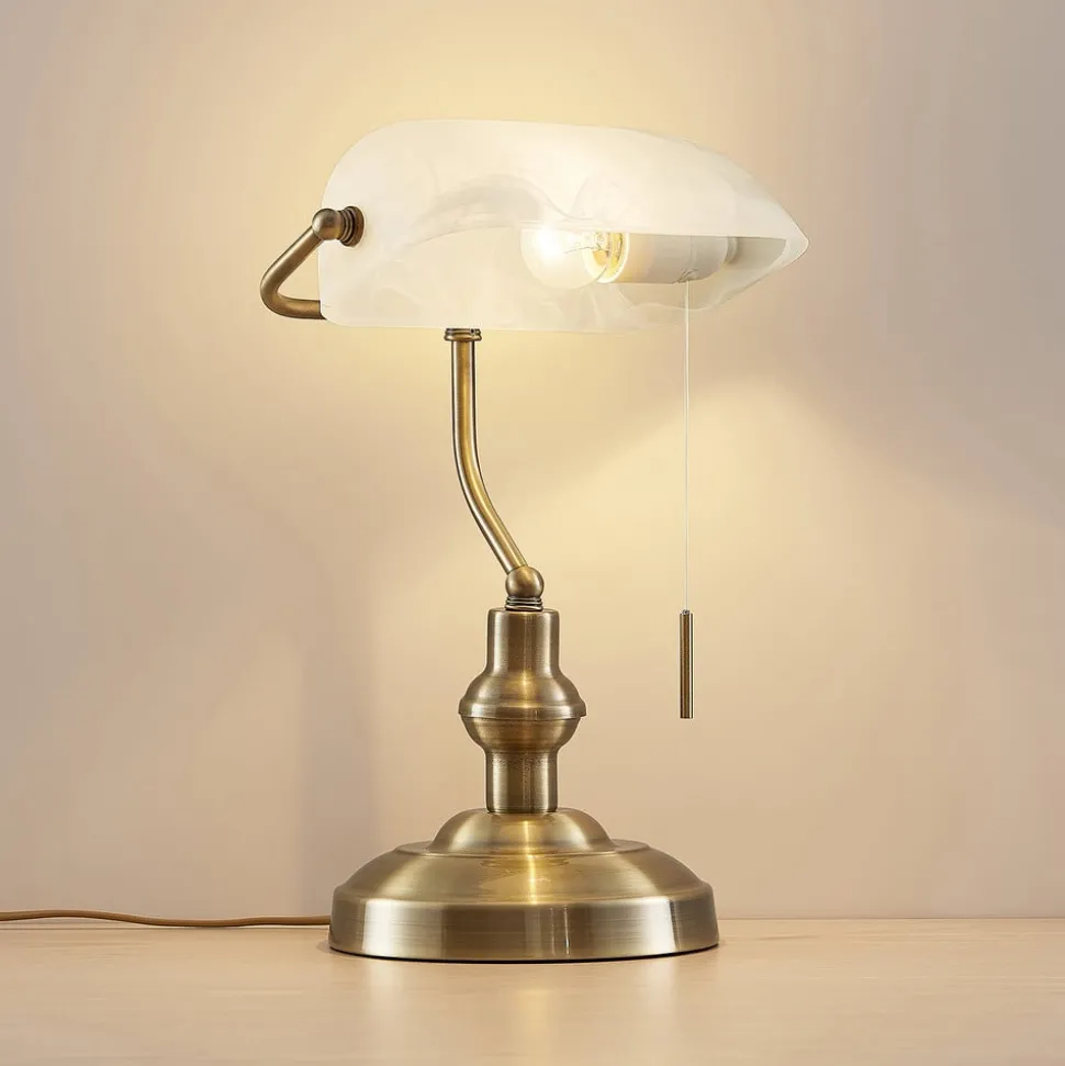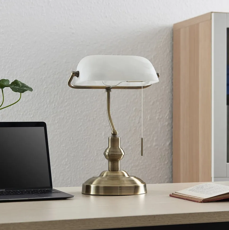 Profina bureaulamp ontworpen in bankiersstijl – optimale lichtbron voor de werkplekDe Profina bureaulamp is ontworpen als een klassieke bankierslamp, die met zijn speciale look een nostalgisch en tegelijkertijd stijlvol effect heeft. De bankierslamp vindt haar oorsprong in het begin van de vorige eeuw, waar ze vooral te vinden was in banken, bibliotheken en advocatenkantoren.Dankzij de gebogen lampenkap van opaalwit glas wordt het licht voornamelijk naar beneden uitgestraald, zodat het werkoppervlak aan tafel goed verlicht is en de omgeving verblindingsvrij blijft. Een praktische trekschakelaar bevindt zich op het armatuur zodat de bediening eenvoudig en handig blijft voor de gebruiker.
