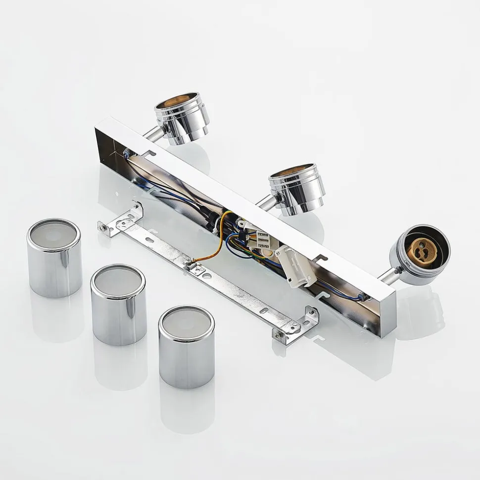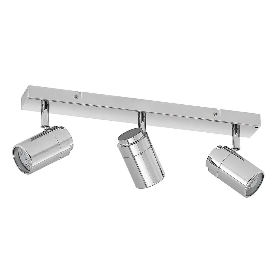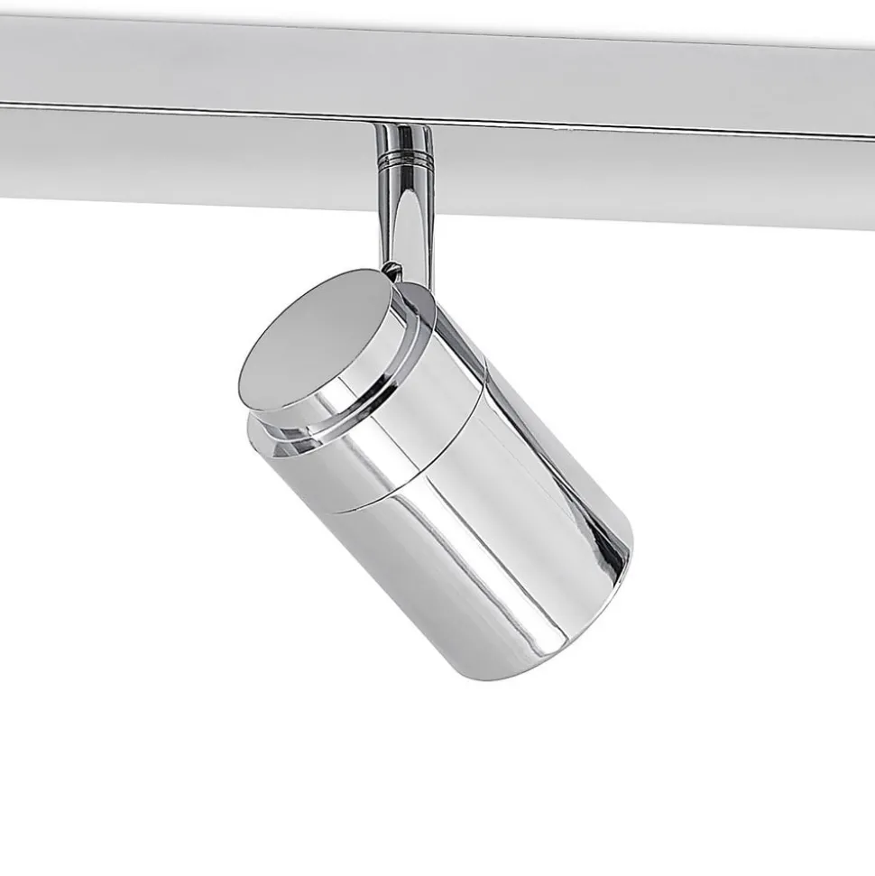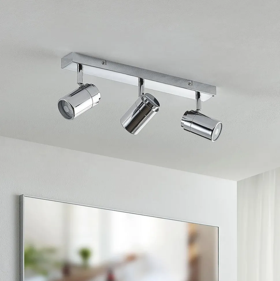 Verstelbare plafondspot Remilan – ideaal voor verlichting in de woonkamer of hal Deze plafondspot maakt indruk met zijn eenvoudige en slanke ontwerp en kan moeiteloos worden gecombineerd met verschillende inrichtingsstijlen. Het moderne ontwerp van Remilan spreekt voor zich. De metalen behuizing en kappen hebben een chroomkleurige afwerking en zien er zeer aantrekkelijk uit aan het plafond. De drie kappen kunnen flexibel worden geplaatst doordat ze elk een kogelgewricht aan de basis hebben.