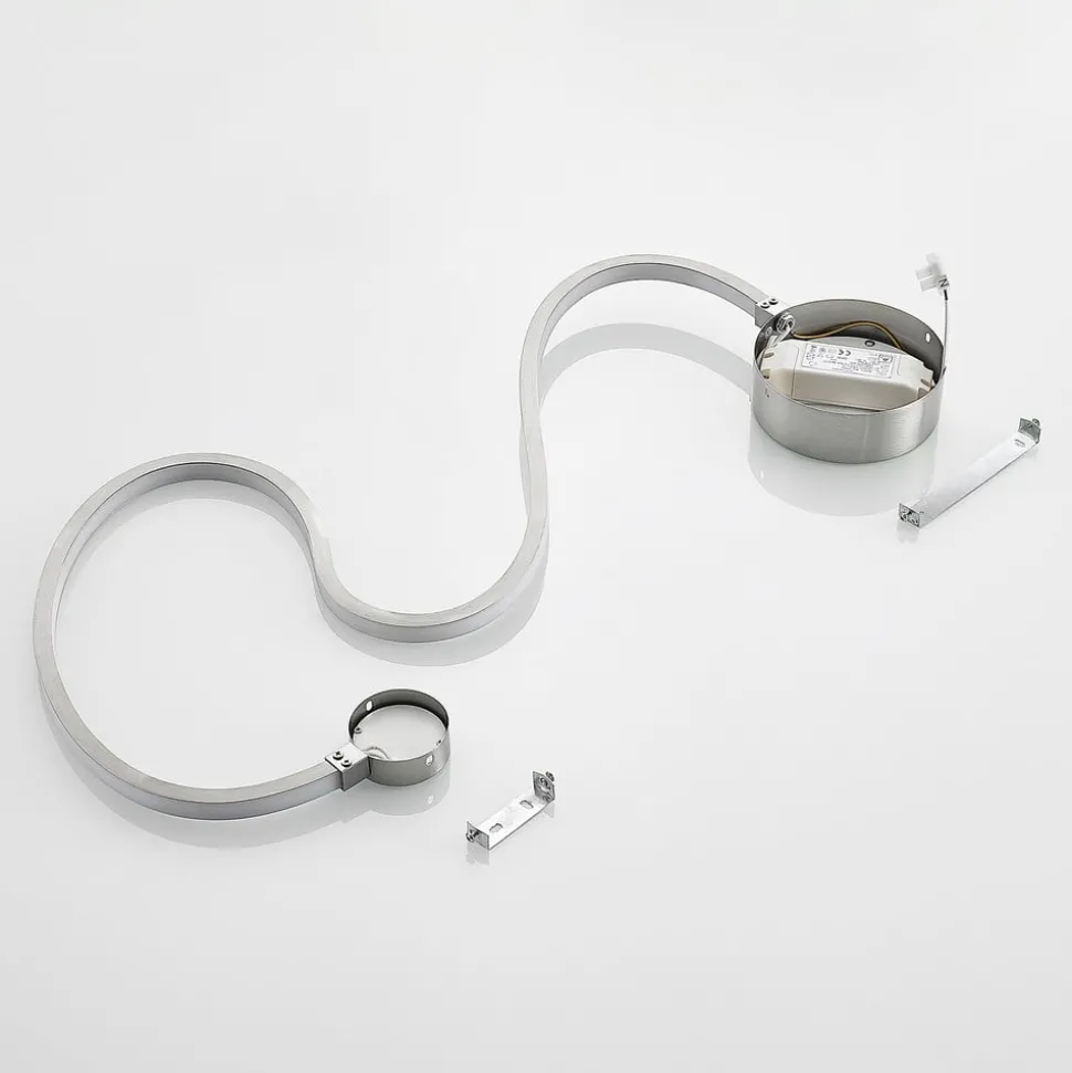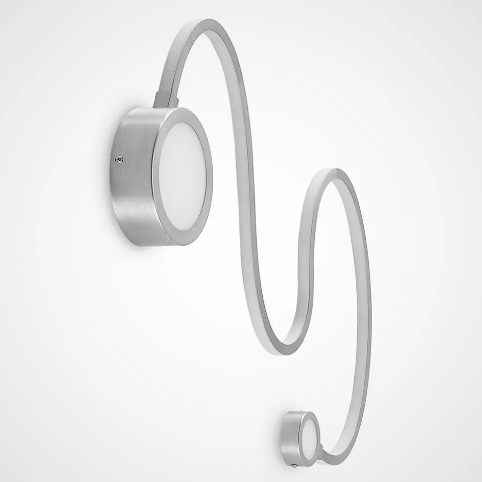 Speelse LED wandlamp Rion in nikkelen afwerking De LED wandlamp Rion heeft een speels nikkelkleurig ontwerp. Hij is gemaakt van aluminium en ijzer en de behuizing bestaat uit gebogen, filigrane lijnen die bewegen tussen twee cirkels van licht. Door haar slanke en discrete uiterlijk past ze moeiteloos in een modern interieur. De LED wandlamp Rion kan tot drie niveaus worden gedimd door meerdere keren op de wandschakelaar te drukken. Dit maakt het mogelijk om de lamp op 100%, 40% of 10% van de lichtsterkte te laten branden. Daarom is het niet alleen een stijlvolle decoratie, maar zorgt het ook voor het juiste licht en een perfecte sfeer in elke situatie. Of hij nu in de woonkamer of slaapkamer staat, hij slaat altijd een goed figuur.