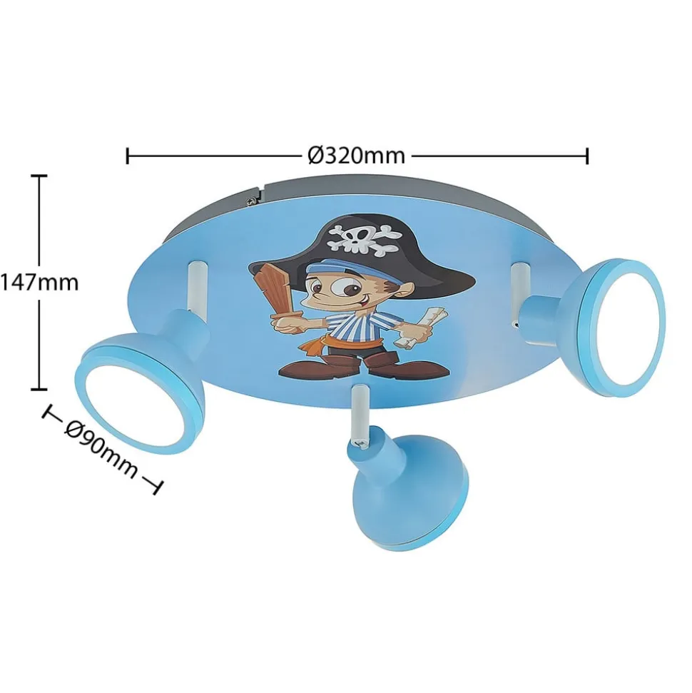 3-lamps Roxas kinderkamer plafondlamp in blauw met piratendesign Roxas is een plafondlamp met een leuke uitstraling en wordt ook geleverd met bijgeleverde lampen die dimbaar zijn qua lichtsterkte. De lamp kan zoals gewoonlijk worden in- en uitgeschakeld met een wandschakelaar. Dankzij de 3-staps dimtechnologie met geïntegreerde uit-functie kan de lamp ook tot drie verschillende helderheidsniveaus worden gedimd door meerdere keren op de schakelaar te drukken: 100%, 50% en 3%. De armatuur van plafondlamp Roxas is gemaakt van blauw ijzer en is versierd met een bedrukte piraat, die het speelse ontwerp afrondt. De plafondlamp is daarom ideaal voor installatie in kinderkamers en creëert een vrolijke sfeer.
