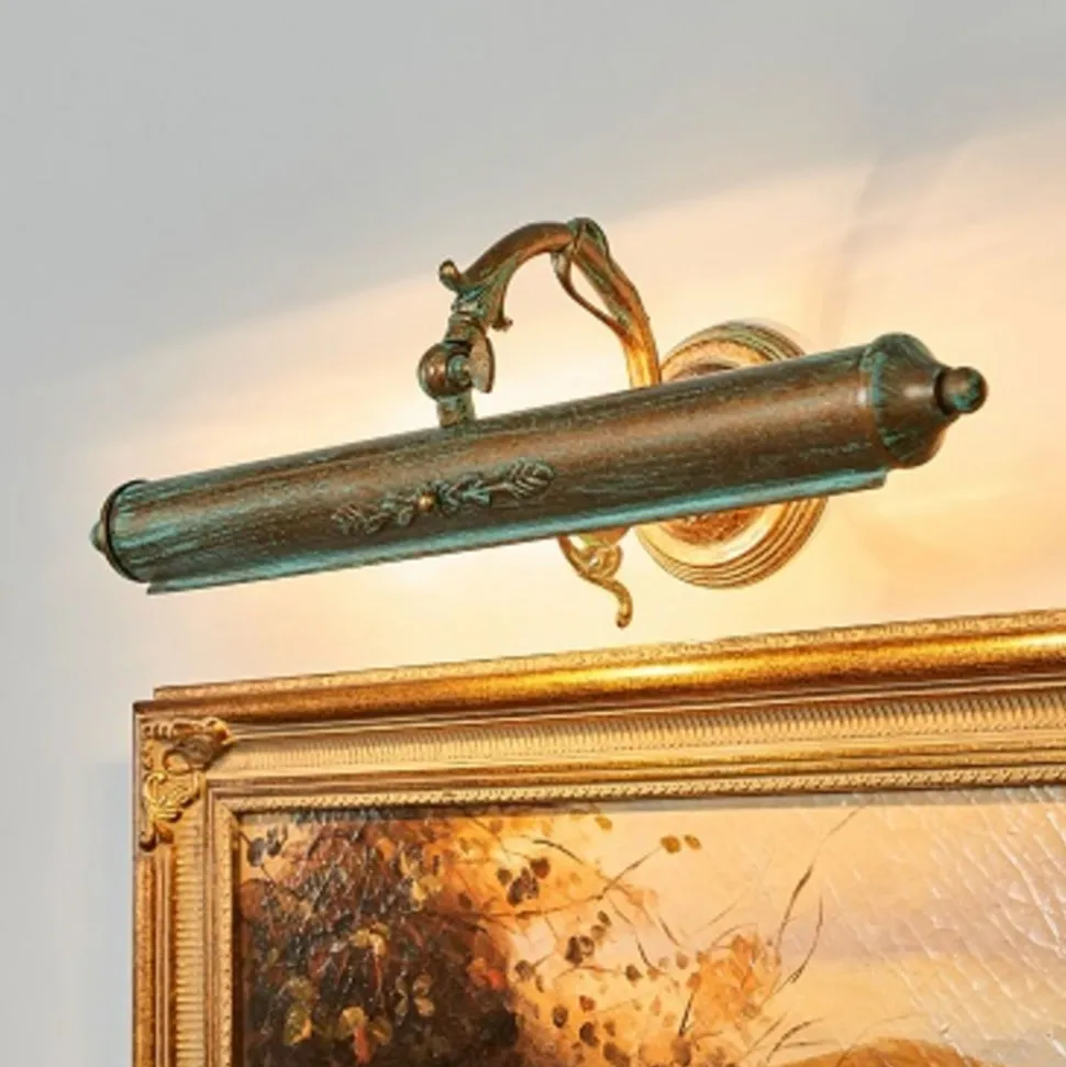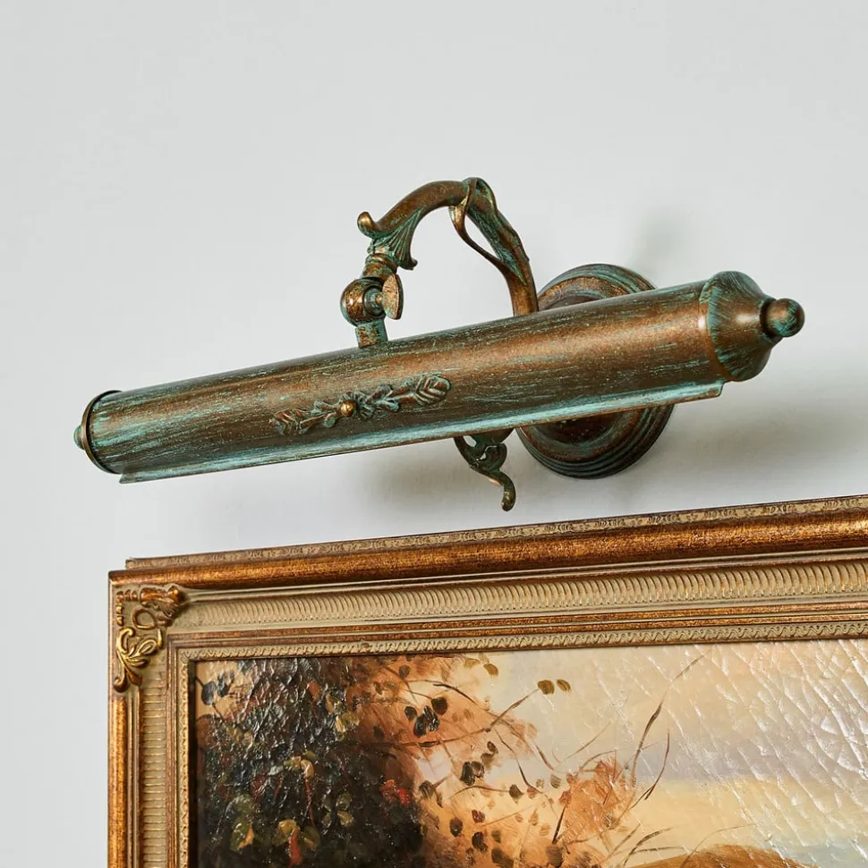 Langwerpige Kalea schilderij verlichting met interessante details op de metalen kap Kalea is uitgerust met twee E14 lampen en kan daardoor het schilderij goed verlichten. Dit kan een schilderij of een tekening zijn, maar net zo goed een kunstdruk of een foto. Omdat het oppervlak met de verdigris-look zo nostalgisch oogt en het decor ook vrij antiek is, kan de schilderij verlichting vooral worden gecombineerd met klassieke woonstijlen, die dan worden verrijkt met een stijlvolle lichtbron.