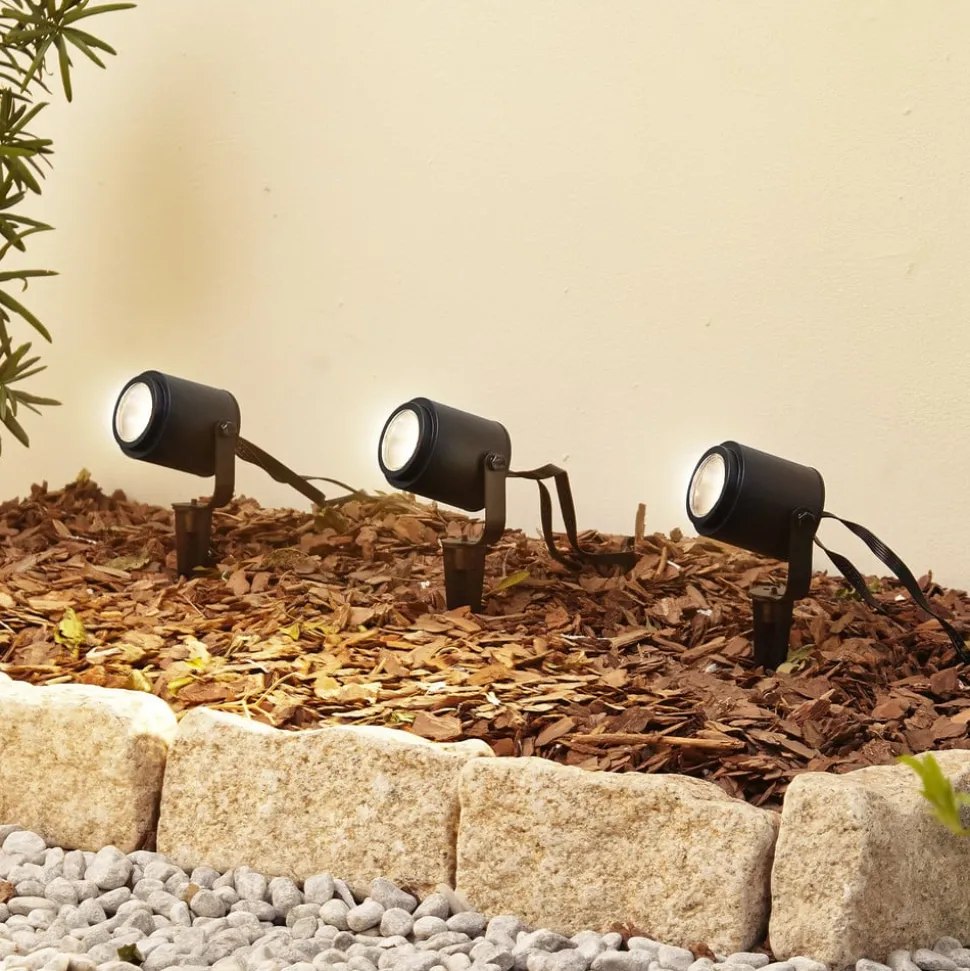 Slim regelbare Nymo LED buitenspot met CCT en RGB functie De Nymo LED buitenspot maakt flexibele en slim regelbare verlichting op het terras of in de tuin mogelijk. Ze hebben een beschermingsgraad van IP44 en zijn daarom geschikt voor buitengebruik. Dankzij de grondspiesmontage kunnen de spots overal worden gebruikt waar licht nodig is. De drie kappen kunnen ook afzonderlijk worden uitgelijnd om optimale lichtomstandigheden te creëren. De drie spots kunnen worden bediend met de gratis Tuya via een smartphone, tablet of spraakbesturing. De lichtkleur kan traploos worden aangepast van warmwit tot daglicht. Het is ook mogelijk om de helderheid in tien stappen te regelen en de RGB kleurverandering te regelen. Zo kan de ideale lichtstemming worden ingesteld afhankelijk van de situatie.