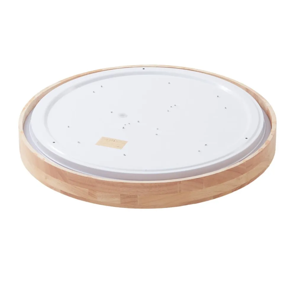 Houten Innes LED plafondlamp met RGBW en dimfunctie Innes is rond en heeft een opvallend ontwerp. Ze is gemaakt van kunststof en hout, wat voor een opvallend contrast zorgt. Het heeft permanent geïnstalleerde LED’s die continu dimbaar zijn en van lichtkleur veranderen (3.000 K – 6.500 K + meerkleurig). Dit alles wordt geregeld met de gratis Tuya (beschikbaar voor iOS en Android), waarmee het bijzonder eenvoudig is om de verlichting aan te passen. Innes is ideaal voor het verlichten van een woonkamer of hal.