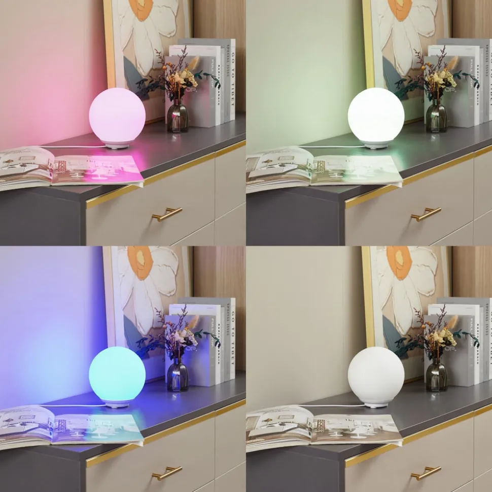 Cosmia bolvormige LED tafellamp met RGB kleurverloop Deze moderne verlichtingsoplossing combineert een glazen kap met een praktische RGB functie. De bovenste en onderste helften van de kap kunnen afzonderlijk worden bediend om een kleurverloop te genereren. Met de meegeleverde dimfunctie kan de helderheid worden aangepast aan elke gelegenheid. De geïntegreerde LED’s zorgen niet alleen voor een lange levensduur, maar ook voor een laag energieverbruik, waardoor de slimme LED tafellamp een intelligente keuze is voor uw huis – Kan worden bediend met de meegeleverde afstandsbediening of de Tuya (beschikbaar voor iOS en Android)