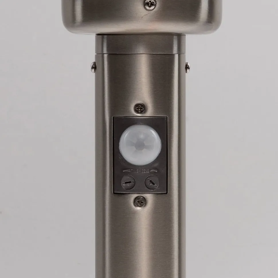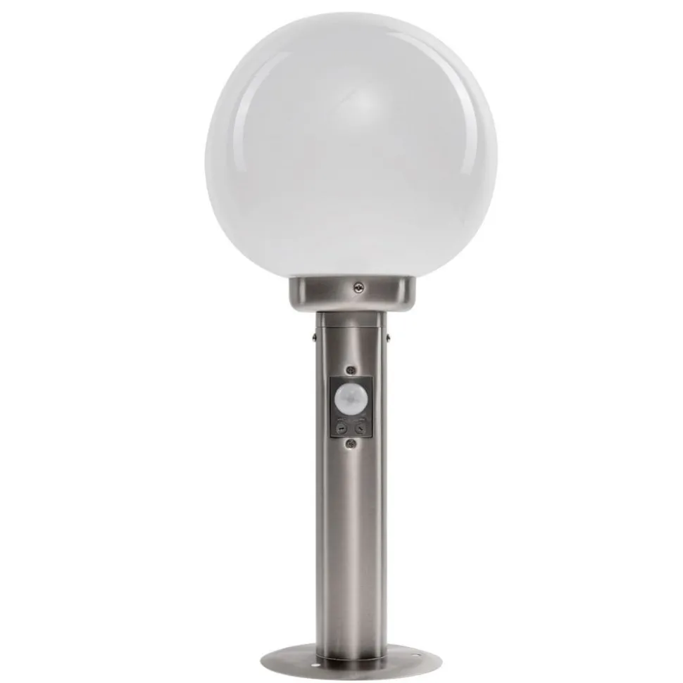 Eenvoudige sokkellamp Vedran met bewegingsmelder en witte glazen bolkap Vedran is een handige aanwinst voor buiten omdat de sokkellamp niet vereist dat iemand naar de schakelaar gaat om hem aan te zetten, omdat hij is uitgerust met een bewegingsmelder die deze taak overneemt. Zodra iemand nadert, herkent de bewegingsmelder de beweging en schakelt Vedran in, zodat de persoon in kwestie niet langer in het donker hoeft te staan of te lopen. Bewegingen worden gedetecteerd onder een hoek van 120°, mits ze zich binnen een bereik van 1 – 8 meter bevinden. Afhankelijk van de vereisten ter plaatse kan de duur van het licht individueel worden ingesteld binnen een bereik van 10 s – 8 min.