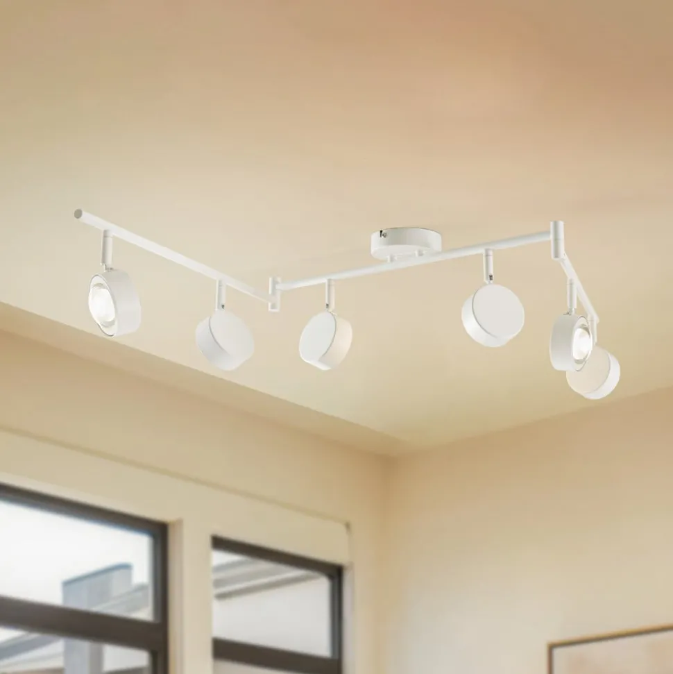 Dimbare Jyla spot met zes verstelbare kappen De 6-lamps plafondspot Jyla is gemaakt van ijzer en de witte buitenkant geeft de omgeving een elegante touch. Tegelijkertijd past hij moeiteloos in verschillende woonruimtes dankzij zijn discrete ontwerp. Hij is bijvoorbeeld ideaal voor gebruik als lichtbron in de gang, keuken, woonkamer of eetkamer. Het frame kan op drie plaatsen worden versteld en de ronde kappen kunnen ook flexibel worden gekanteld en gedraaid. Hierdoor kan het licht worden aangepast en de ruimte optimaal worden verlicht. De meegeleverde GX53 lampen hebben een gebogen lens en zien er daardoor uit als glazen halve bollen. Het licht kan zoals gebruikelijk met een wandschakelaar worden in- en uitgeschakeld. Dankzij de 3-staps dimtechnologie met geïntegreerde uit-functie kan de lamp ook tot drie verschillende helderheidsniveaus worden gedimd door meerdere keren op de schakelaar te drukken: 100%, 50% en 25%.