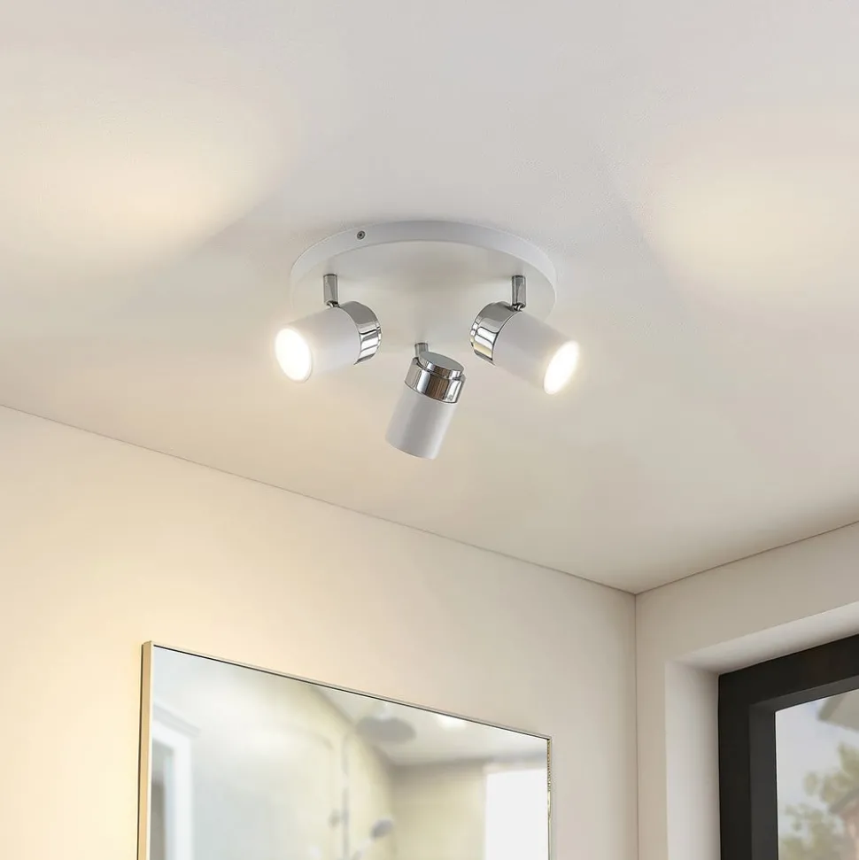 Plafondlamp Kardo met 3-lamps witte afwerking – ideaal voor de badkamer dankzij IP44 Kardo heeft een moderne uitstraling, maar ook tijdloze kwaliteiten. Drie beweegbare kappen zijn bevestigd aan een ronde metalen plafondhouder, die ook van metaal zijn en met scharnieren aan de plafondplaat zijn bevestigd, zodat ze naar wens kunnen worden verplaatst. Dankzij de GU10 fittingen kun je lampen naar keuze gebruiken, waaronder de populaire en energiebesparende LED lampen. De plafondlamp is goed beschermd en heeft het label IP44, waardoor hij zeer geschikt is voor gebruik in de badkamer.