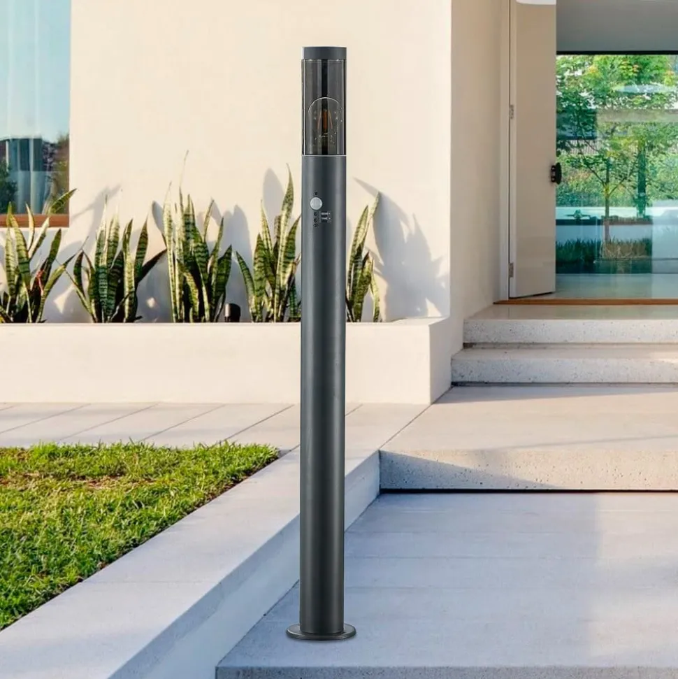 Antracietkleurige Statius tuinpadverlichting van zwart ijzer De Statius tuinpadverlichting zorgt voor een harmonieuze verlichting van de buitenruimte. Hij is gemaakt van en heeft een modern, eenvoudig ontwerp dat wordt afgerond door de zwarte kleur. De lamp kan worden uitgerust met E27 lampen en biedt daarom een vrije keuze aan lichtkleuren die kunnen worden aangepast aan je eigen wensen. De praktische sensor op de behuizing regelt het licht met behulp van beweging, waardoor het een praktische metgezel voor buiten is – Detectiebereik 1-8 m – Detectiehoek 120°