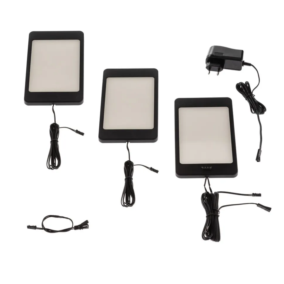 Dimbare Svela LED meubelverlichting in een set van 3 als praktische verlichting voor aanrechten en meubels De Svela LED meubelverlichting zorgt voor een goede verlichting met een zuinig stroomverbruik. Dankzij de lange kabel kan hij flexibel aan meubels worden bevestigd en geeft hij aangenaam licht bij het werken aan het aanrecht of als accentverlichting voor woonkamermeubels. De hoekige behuizing is volledig in zwart ontworpen en valt niet meteen op dankzij de discrete kleurstelling en het slanke ontwerp. Het bijzondere aan Svela is de geïntegreerde dimfunctie, die werkt door middel van een sensor. Hierdoor kan de gebruiker de helderheid aanpassen aan zijn individuele behoeften door middel van continu dimmen.