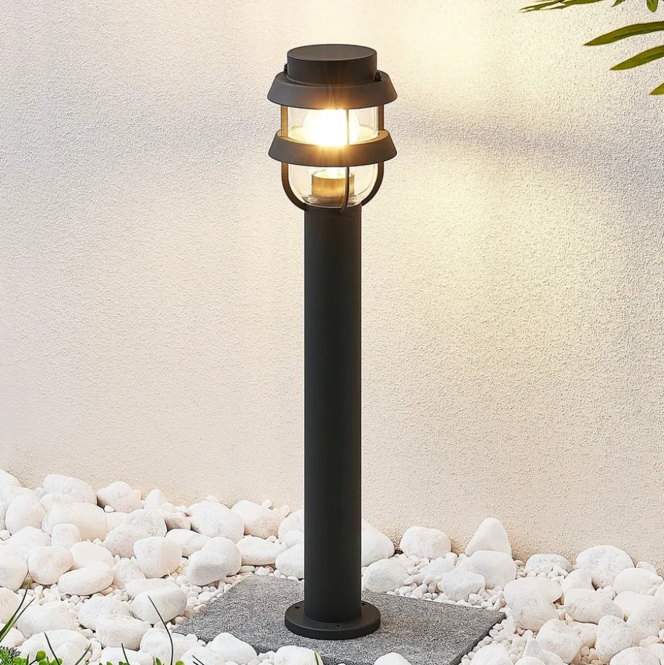 Antracietkleurige tuinpadverlichting Alvaro met twee ringvormige lichtkappen Alvaro is een tuinpadverlichting die tuinpaden en opritten optimaal verlicht, zodat je ook na zonsondergang je weg kunt vinden. Twee ringvormige elementen maken deel uit van de lampenkop. Dankzij het inzetstuk van helder glas dat de lamp beschermt, is het zicht op de gebruikte lamp relatief onbelemmerd, dus kies er een met bijpassende optiek. LED lampen met filament technologie, die eruit zien als klassieke gloeilampen, worden aanbevolen.