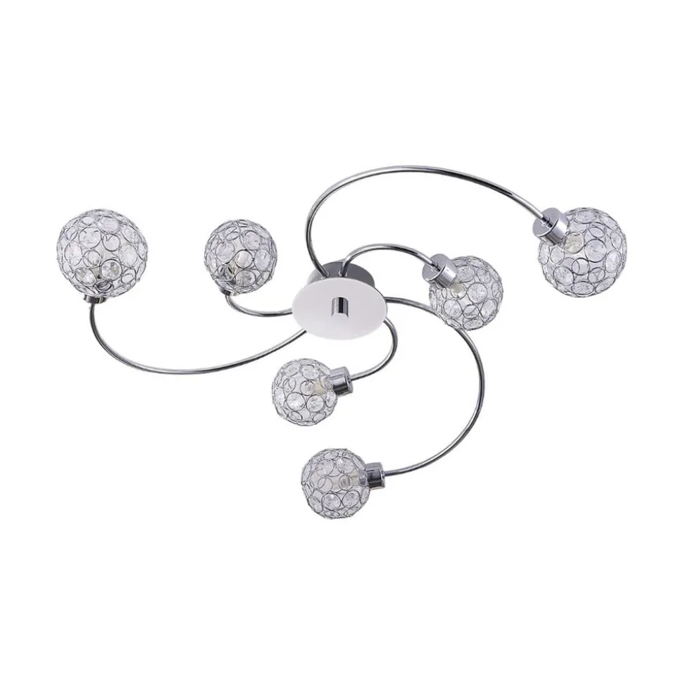Sieraden plafondlamp Tyron De plafondlamp Tyron geeft een speciale uitdrukking van symmetrie en harmonie. De bolvormige kappen zijn er in verschillende maten en zijn gemaakt van metaal afgewisseld met prachtige glazen edelstenen. Dit creëert een speciale sprankeling die echt past in een moderne woonruimte omdat het elegantie en glamour symboliseert. Hij kan worden uitgerust met passende lampen.