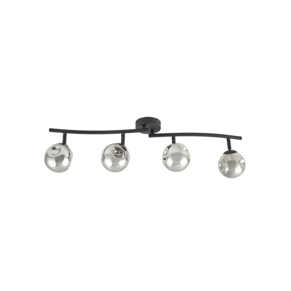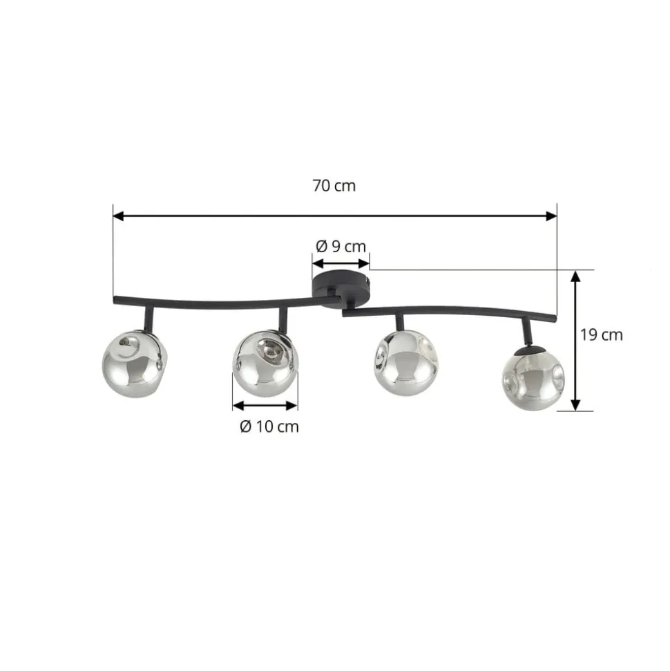 4-lamps plafondlamp Valentina van ijzer en glas De plafondlamp Valentina combineert elegantie en functionaliteit in haar ontwerp en creëert een sfeer die kamers een nieuwe dimensie van esthetiek geeft. Met haar moderne stijl en 4-lamps uitvoering in grijs en zwart past ze naadloos in het ontwerp van de woonkamer, eetkamer of hal. Het gebruik van glas als materiaal benadrukt de hoogwaardige uitstraling en zorgt voor een gelijkmatige lichtverdeling.
