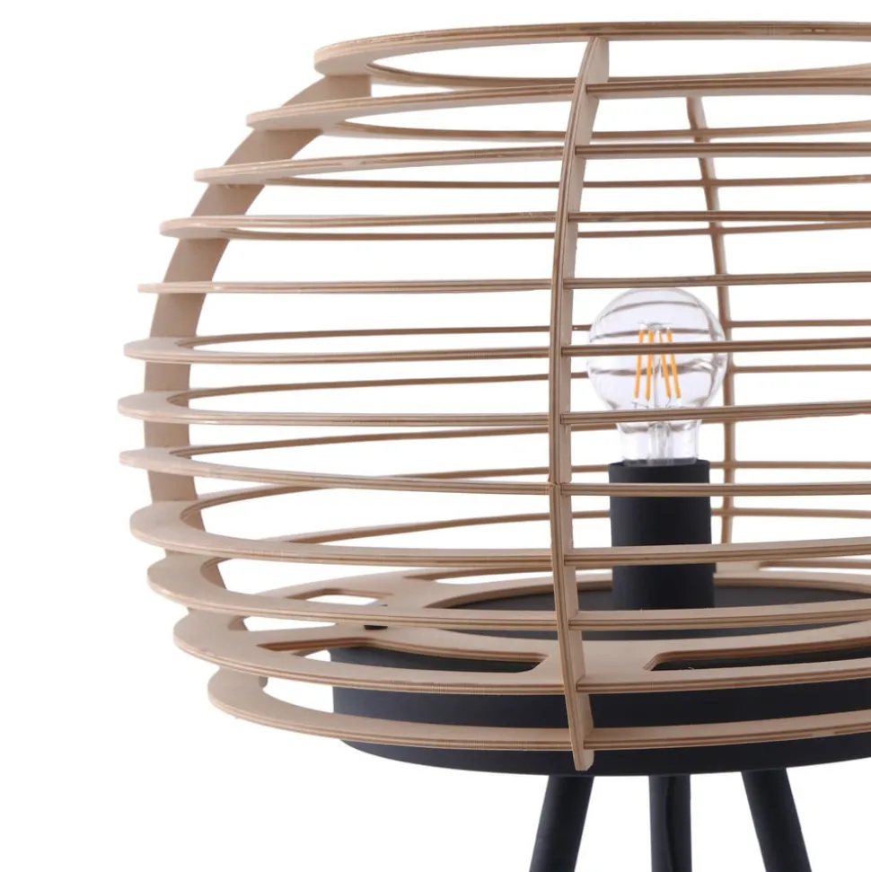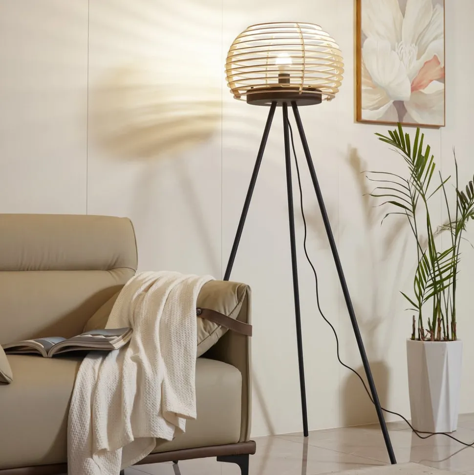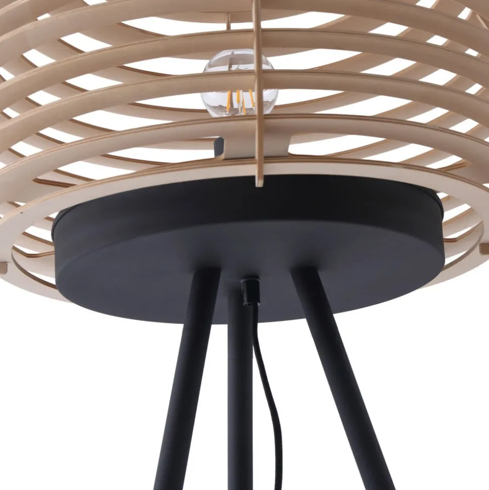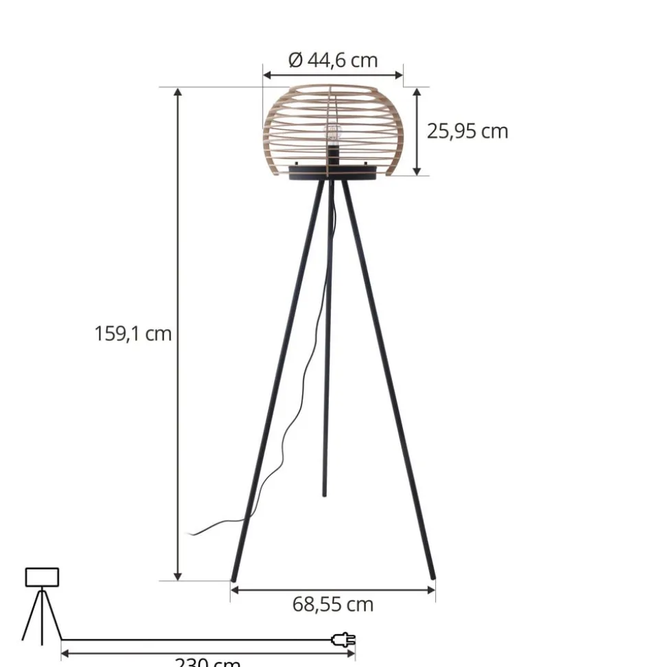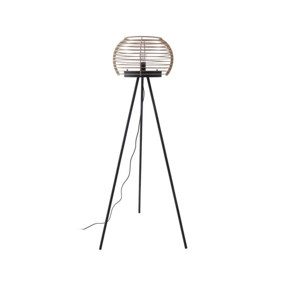 Ediz vloerlamp met driepoot frame en ronde houten kap De Ediz vloerlamp bestaat uit een ijzeren frame en een ronde houten kap en is een bijzondere blikvanger voor in de woonkamer. Of het nu in de eetkamer, hal of woonkamer is – de houten kap en het ijzeren frame geven de vloerlamp een natuurlijke en toch moderne touch aan de omgeving. De open kap creëert prachtige lichteffecten in de kamer en een decoratieve lichtbron is bijzonder geschikt voor verlichting. Ediz wordt in- en uitgeschakeld met een voetschakelaar die in het snoer is geïntegreerd.