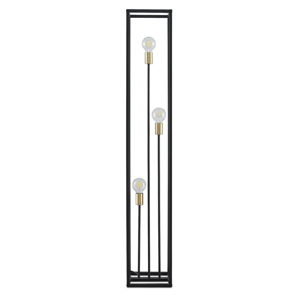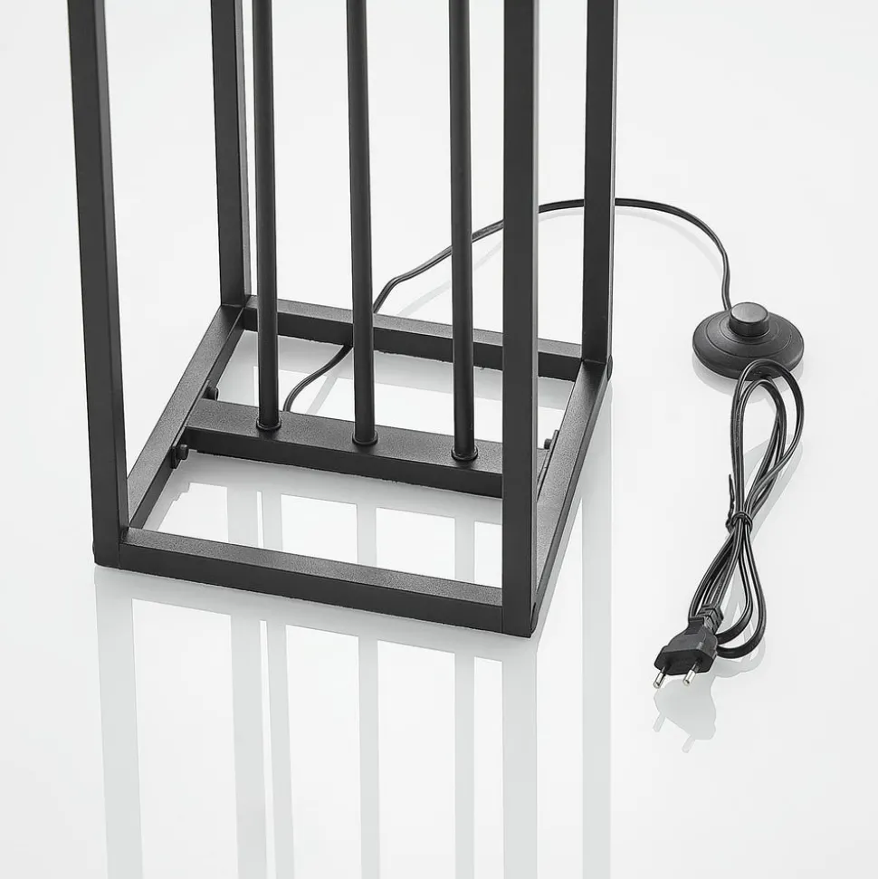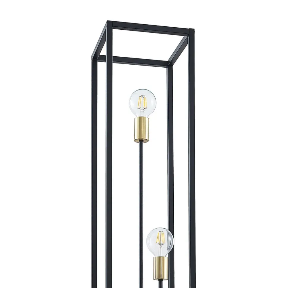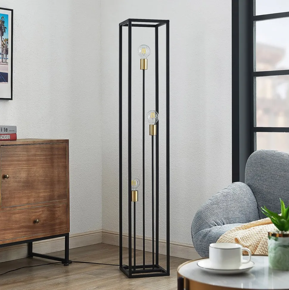 Tiliano vloerlamp in doosvorm met drie vrij zichtbare E27 lichtbronnen De Tiliano vloerlamp is absoluut een bezienswaardig verlichtingsobject, dat weinig gemeen heeft met klassieke vertegenwoordigers van zijn soort en in plaats daarvan een moderne en designgerichte verlichtingsoplossing voor woonruimtes vertegenwoordigt. In plaats van kappen is er een framevormig metalen element van mat zwart ijzer, dat de vorm heeft van een kubus en aan alle kanten volledig open is. Binnenin de structuur zitten drie staven, ook in zwart, die op verschillende hoogtes eindigen en samenvloeien in een E27 fitting. Lampen kunnen naar wens worden gekozen, maar vanwege hun goede zichtbaarheid en merkbare bijdrage aan de algehele look, moeten ze niet alleen worden geselecteerd op basis van technische aspecten, maar ook met het oog op hun uiterlijk. Gloeilampen of rustieke lampen, die ook verkrijgbaar zijn met efficiënte LED-technologie, zijn bijzonder geschikt omdat hun uiterlijk klassieke gloeilampen of kooldraadlampen imiteert. Een geweldige vloerlamp voor een opvallende look in de hele woonkamer, die goed past bij moderne interieurs met zijn rechte lijnen, maar ook heel goed kan passen bij bepaalde vintage en Scandi stijlen!