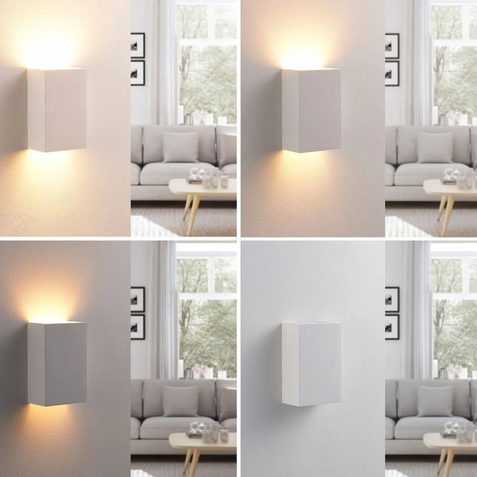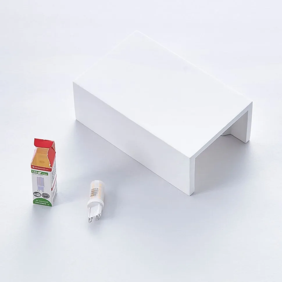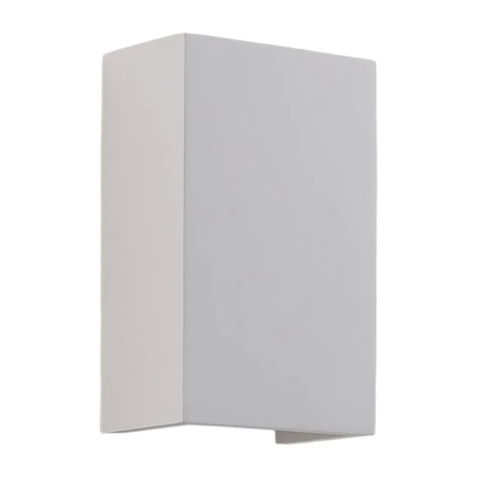 Colja wandlamp van wit gips De armatuur van de wandlamp is gemaakt van wit gips en heeft een tijdloze hoekige vorm. Als je het uiterlijk wilt aanpassen, kun je de wandlamp schilderen in de kleur van je keuze of zelfs een uniek motief toevoegen.