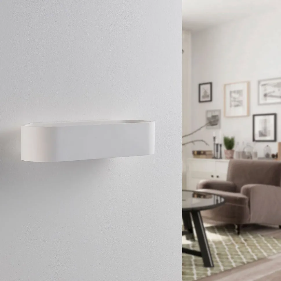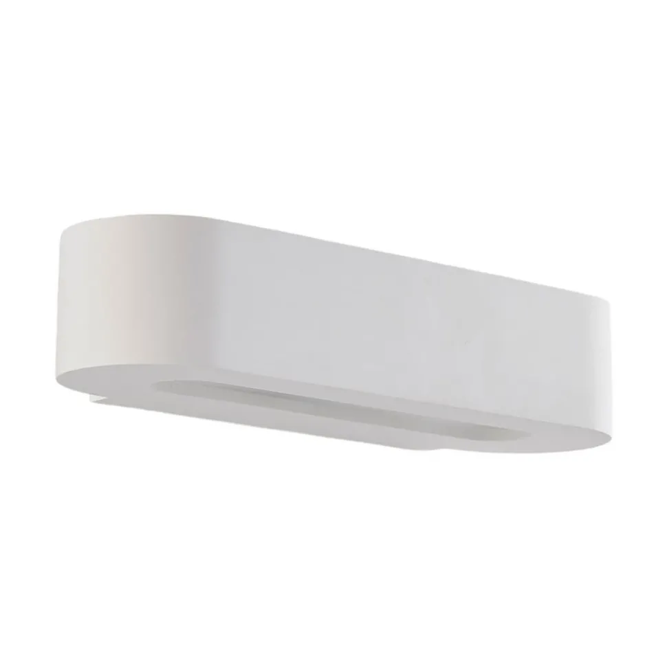 Aantrekkelijke gipsen wandlamp Fioni in wit Fioni heeft een afgeronde, ovale vorm, waardoor een bijzonder harmonieuze uitdrukking ontstaat. Het licht schijnt zowel naar boven als naar beneden, maar de lichtbron is nauwelijks zichtbaar. Hierdoor is er geen verblindende schittering en is het algehele effect gezellig. Als je de kleur van het witte oppervlak wilt aanpassen, kun je een kwast en verf pakken en het ontwerpen volgens je eigen ideeën.