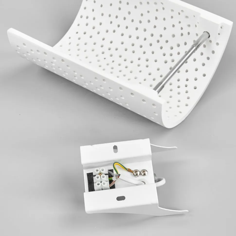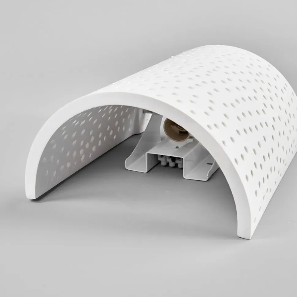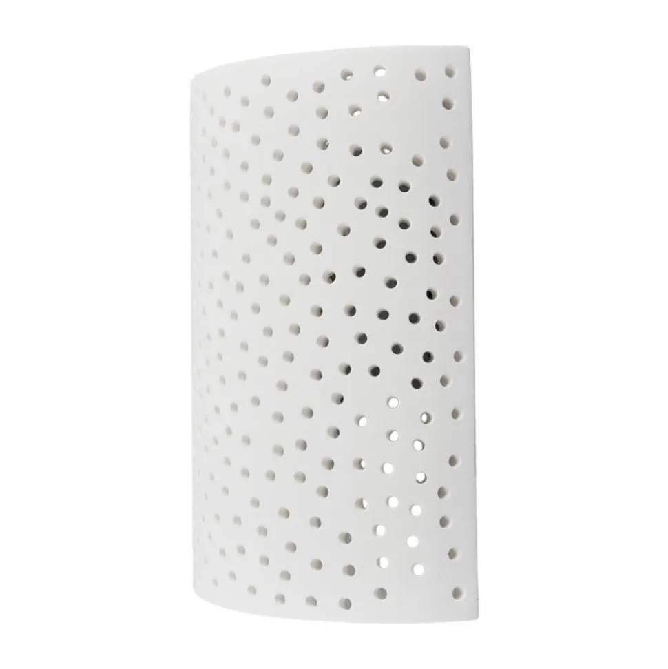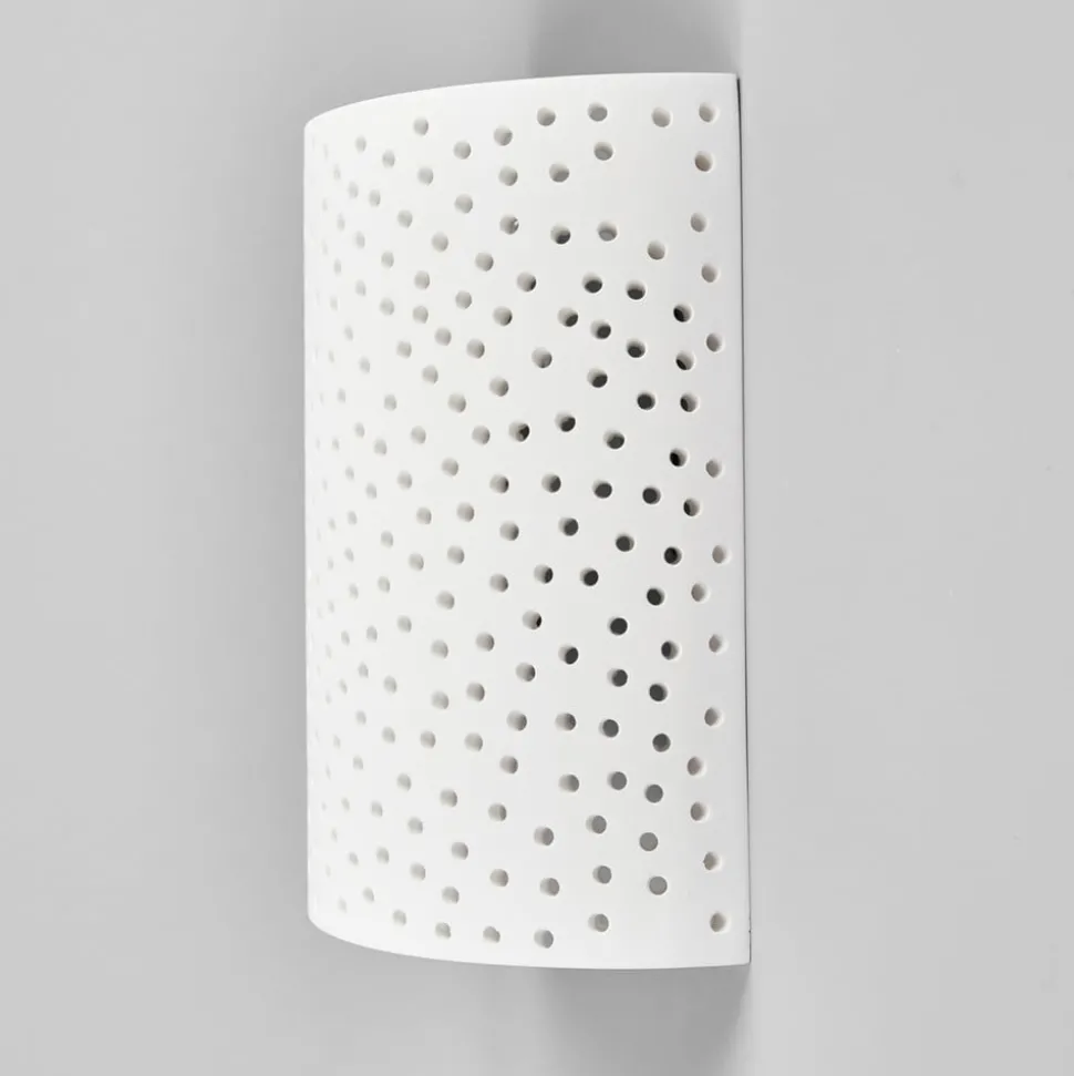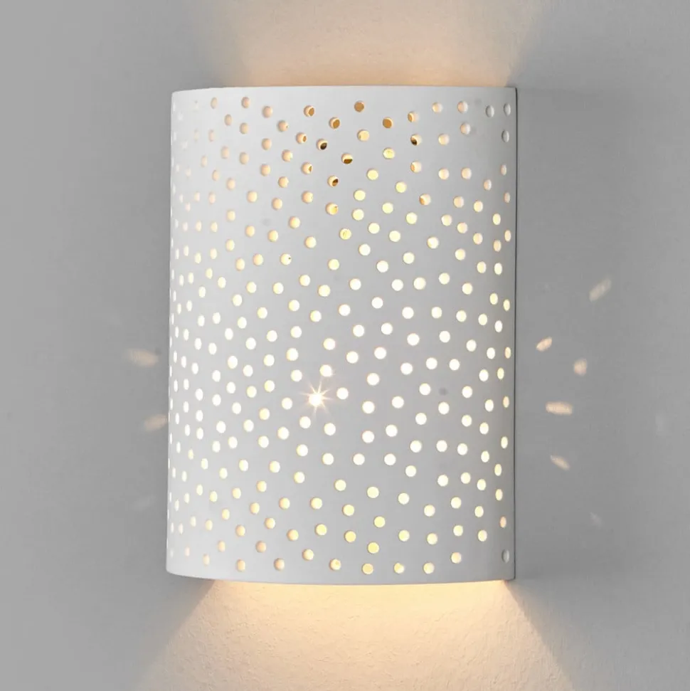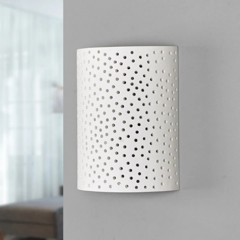 Jiru wandlamp van gips met decoratief gaatjespatroon De kap van deze wandlamp van gips is zacht gebogen als een scherm en het meeste licht ontsnapt naar boven en beneden. Omdat het gipsen oppervlak echter niet doorlopend is, maar er talloze kleine gaatjes doorheen lopen die samen een mooi gaatjespatroon vormen, kan ook hier wat licht ontsnappen en zie je een prachtige schittering van vele lichtpuntjes die kunstig door de kap heen breken. De wandlamp Jiru is daarom bijzonder geschikt als extra of accentverlichting, omdat de nadruk natuurlijk niet ligt op felle verlichting, maar op een sfeervol effect.
