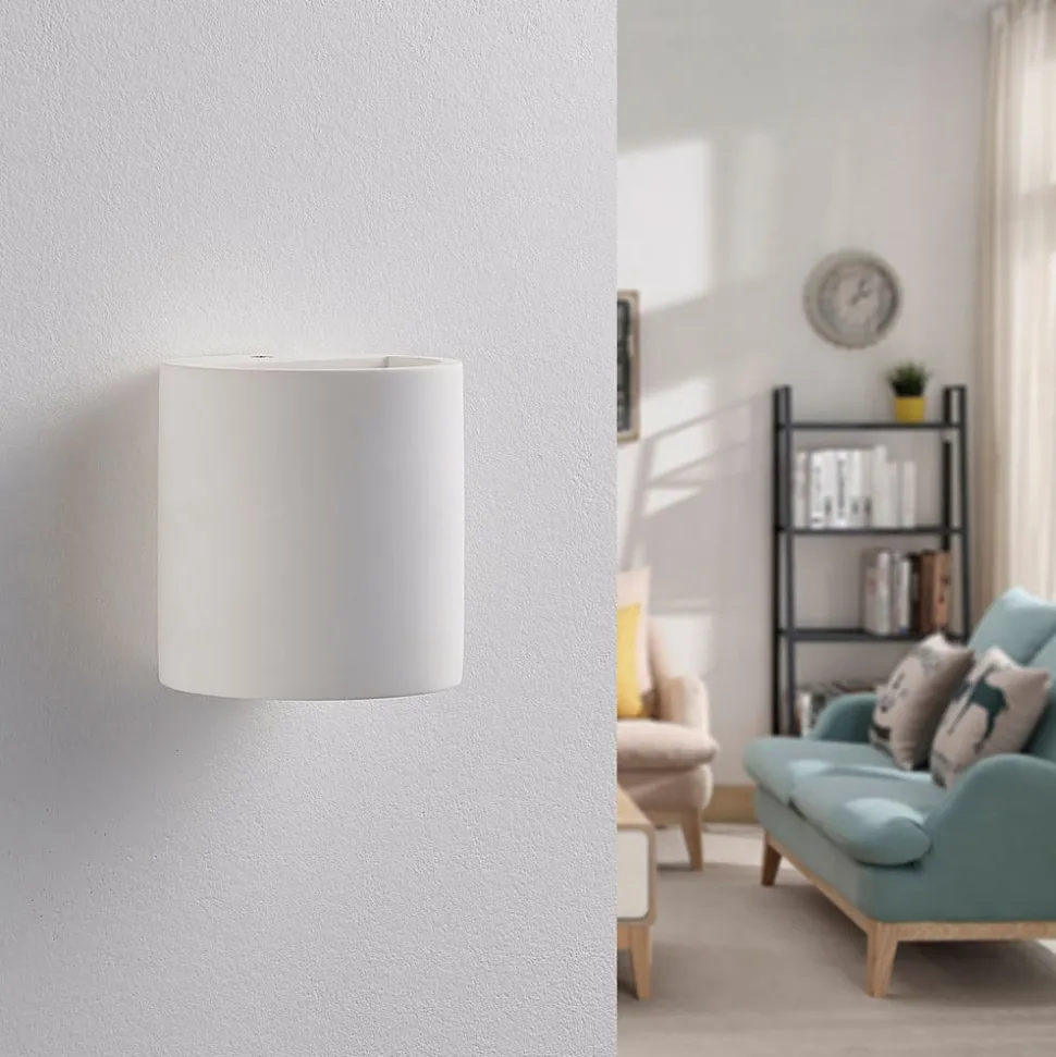 Krista – wandlamp in wit gips, overschilderbaar De wandlamp in gips Krista heeft een cilindrische vorm en straalt licht naar boven en beneden uit doordat de kap daar open is. Dit creëert een gezellig lichteffect dat ideaal is als accentverlichting en is gemaakt van wit gips, wat het armatuur een bijzonder harmonieuze uitstraling geeft. Als je wilt, kun je het oppervlak echter ook verven of kleuren, wat eenvoudig mogelijk is met gips.
