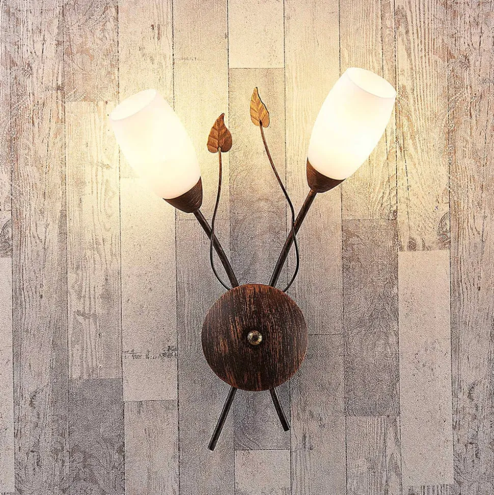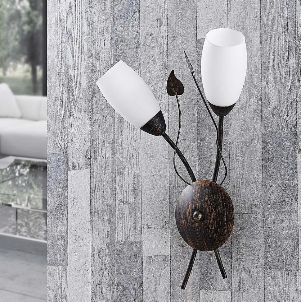 Wandlamp Stefania met zwart en goud oppervlak Stefania heeft een vrij klassieke uitstraling en past daarom des te beter bij interieurs die wat speelser mogen zijn. Het metalen frame is zwart, maar is ook afgewerkt met fijne gouden penseelstreken en doet daardoor soms denken aan een bruinachtige kleur. De glazen kappen zijn gobletvormig en wit, waardoor een sfeervol, egaal licht ontstaat. De kappen hebben elk ruimte voor een E14 lamp (niet inbegrepen, zie accessoires).