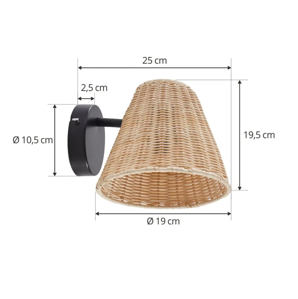 Zyralia 1-lamp wandlamp met ijzeren muurbeugel en kap van rotan Deze decoratieve wandlamp geeft niet alleen mooi licht, maar creëert ook een gezellige sfeer. Met haar aantrekkelijke uiterlijk maakt de wandlamp het verlichtingsconcept van elke woonruimte effectief compleet. De lamp kan naar wens worden gedimd met een externe dimmer (niet inbegrepen). Deze wandlamp combineert alle kwaliteiten en HighLights van het merk Lindby. De wandlamp kan worden voorzien van lampen met een E27 lampvoet. Deze lamp creëert een aangename sfeer in elke ruimte en voegt een tijdloos tintje toe aan je interieur. Dankzij het opvallende uiterlijk harmonieert de lamp in de kleuren hout en zwart met bijna elk interieur en creëert een geweldig woongevoel. Geef je verlichtingsconcept de finishing touch – met deze geweldige wandlamp.