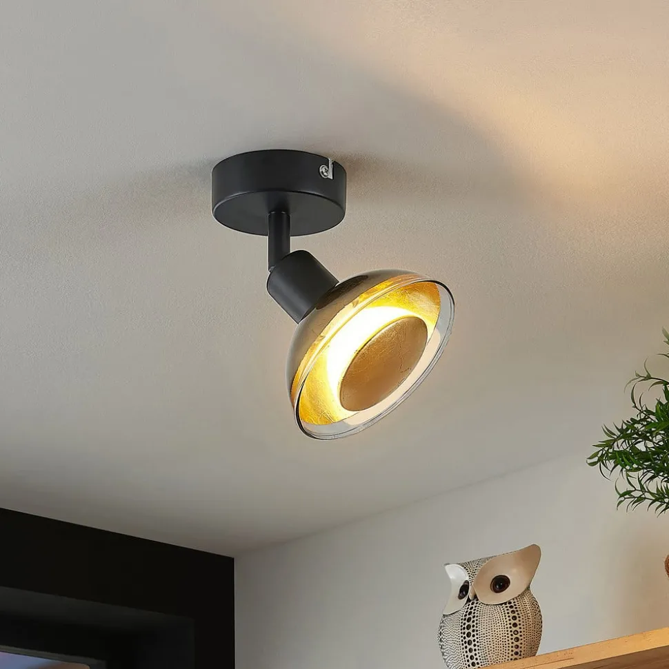 Wandlamp Erin in zwart en goud De wandlamp Erin kan worden gebruikt om stralende accenten in huis te creëren. De binnenkant van de glazen kap is gekleurd in bladgoudlook. Dit geldt ook voor het oppervlak van de meegeleverde LED lamp. De kleuring zorgt voor een effectieve verlichting die gezellige warmte uitstraalt. Het schrille contrast met het zwarte metalen frame is perfect op elkaar afgestemd en geeft de lamp een moderne uitstraling. De spot is geschikt voor zowel wand- als plafondmontage. De lampenkop kan variabel worden versteld voor een ideale uitlijning van het licht.