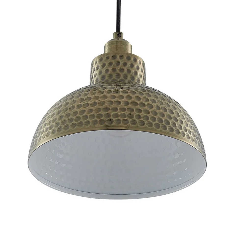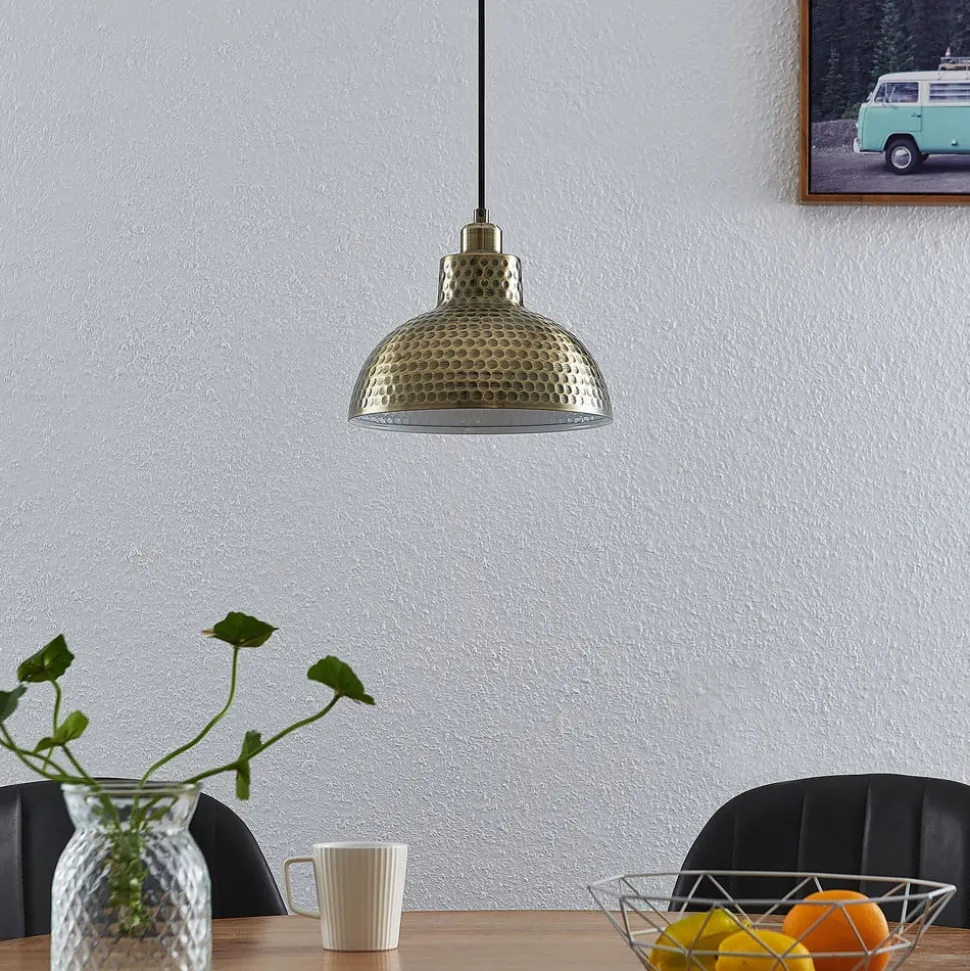 Antiek messingkleurige hanglamp Zelotta met gehamerde look – prachtige verlichting boven de keukentafel Deze 1-lamp hanglamp heeft een relatief klassieke uitstraling door de metalen lampenkap met antiek messing afwerking. Het bijzondere is dat het oppervlak eruitziet alsof het met kleine hamerslagen is afgewerkt. Al met al zorgen deze structuur, de antiek uitziende antiek messing afwerking en de vorm van de lamp voor een vintage ontwerp dat een mooi figuur slaat in passende interieurs en dat iets extra’s biedt. Omdat de kap aan de onderkant open is, maar verder ondoorzichtig, wordt het licht naar beneden gericht, waar het een tafelblad of aanrecht kan verlichten. Het omgevingslicht heeft echter altijd een gezellig effect en wordt gedimd. Geschikte lampen zijn decoratieve filament lampen, die mooi bij het algemene ontwerp passen.
