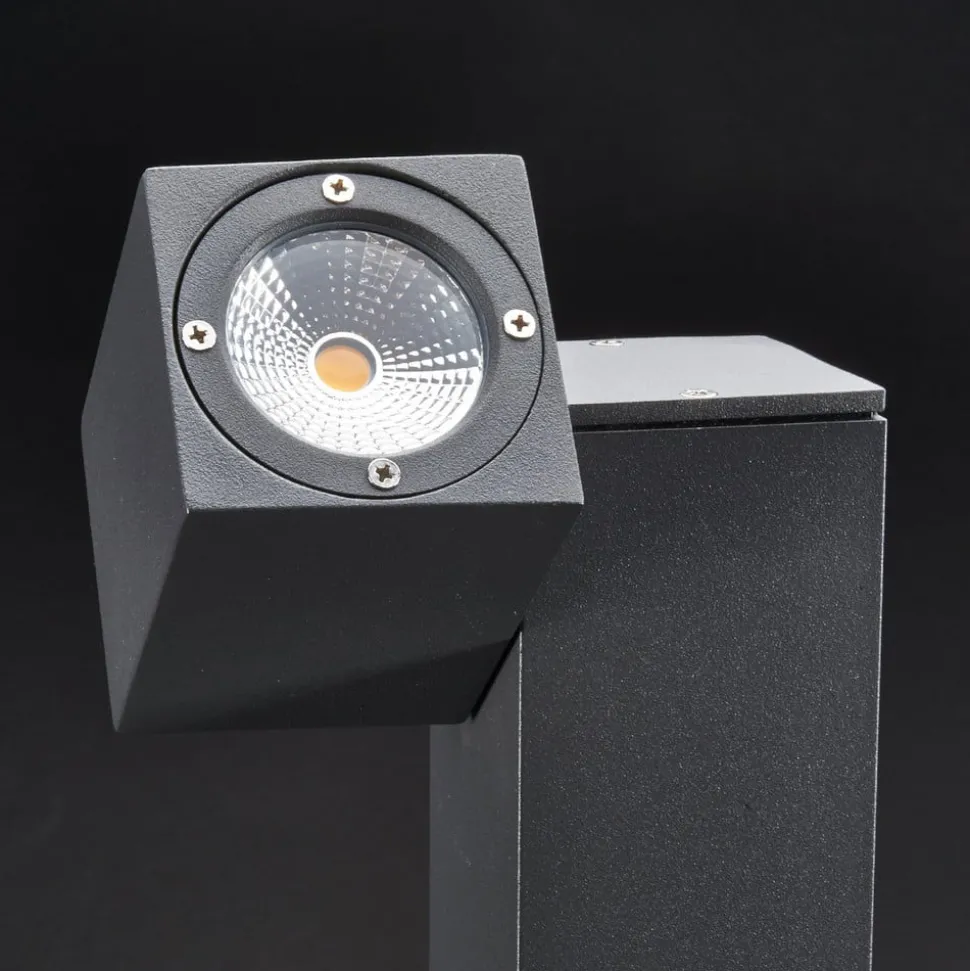 Lorik padverlichting met LED’s en instelbare lichtemissie De lampenkop – net als het frame in een moderne kubusvorm – is niet star bevestigd aan de LED tuinpadverlichting, maar kan naar wens worden uitgelijnd en aangepast aan de omgeving. Dankzij de mobiliteit kan de lampenkop tot 320° worden gedraaid. Het licht kan dus naar boven, beneden of opzij worden gericht, of ergens daartussenin. Het modern ogende frame is grafietgrijs gelakt en de Bridgelux LED lamp schijnt in een warmwitte lichtkleur. De Lorik LED tuinpadverlichting slaat een uitstekend figuur langs paden en opritten in moderne gebouwencomplexen!