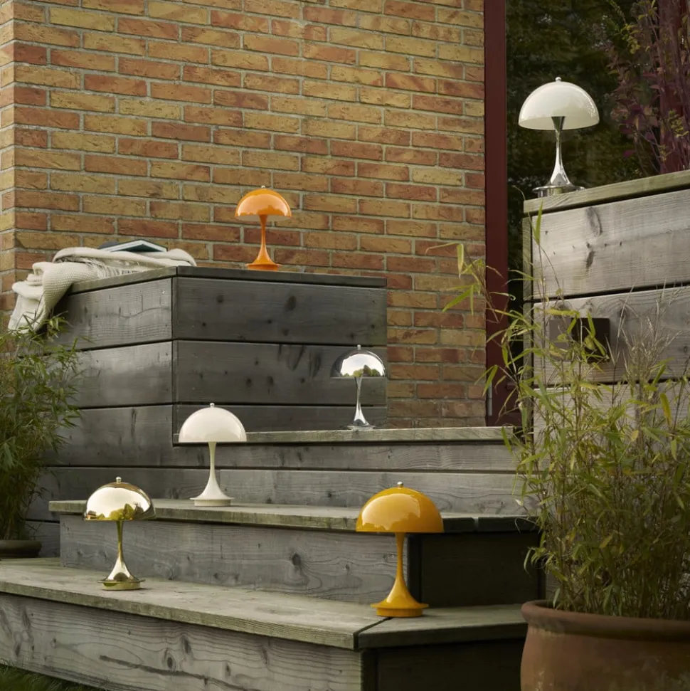 Panthella Portable 160 LED tafellamp op batterijen, versie 3 De 3e versie van de Panthella Portable 160 LED tafellamp op batterijen is gemaakt van spuitgegoten, gerecycled polymeer. De lamp is uitgerust met een aanraakschakelaar op de bovenste moer, waarmee de lamp kan worden in- en uitgeschakeld en ingesteld op drie helderheidsniveaus. Het ontwerp van de Panthella armatuur is een van de belangrijkste ontwerpen van Verner Panton en weerspiegelt de grote persoonlijkheid van de Deense architect. Hij wilde een organisch gevormde armatuur ontwerpen die 100% niet-verblindend licht geeft, waarbij de standaard en de kap als lichtreflectoren fungeren. Panton ontwikkelde het Panthella armatuur in 1971 in samenwerking met Louis Poulsen. De karakteristieke vorm van de lamp en het vermogen om een zacht licht te weerkaatsen vanaf de trompetvormige voet hebben de lamp de status van designicoon bezorgd. De Panthella 160 Portable armatuur is een verkleinde versie van het originele ontwerp, perfect om mee te nemen van kamer naar kamer of buiten op het balkon of in de tuin. Het ziet er overal geweldig uit en creëert een prachtige sfeer – incl. Li-Ion batterij 18650 1,5 V 3100 mAh – incl. 150 cm USB-oplaadkabel 150 cm lange USB-oplaadkabel (adapter niet inbegrepen) – witte lichtindicator in de voet wanneer de lamp wordt opgeladen – kan worden omgeschakeld naar drie helderheidsniveaus: 100 %, 33 %, 10 % helderheid – verlichtingstijd bij 100 % helderheid: 8,5 uur, bij 33 % helderheid: 25,5 uur en bij 10 % helderheid: 79 uur – oplaadtijd van de batterij: 5 uur – levensduur van de batterij: 500 oplaadcycli