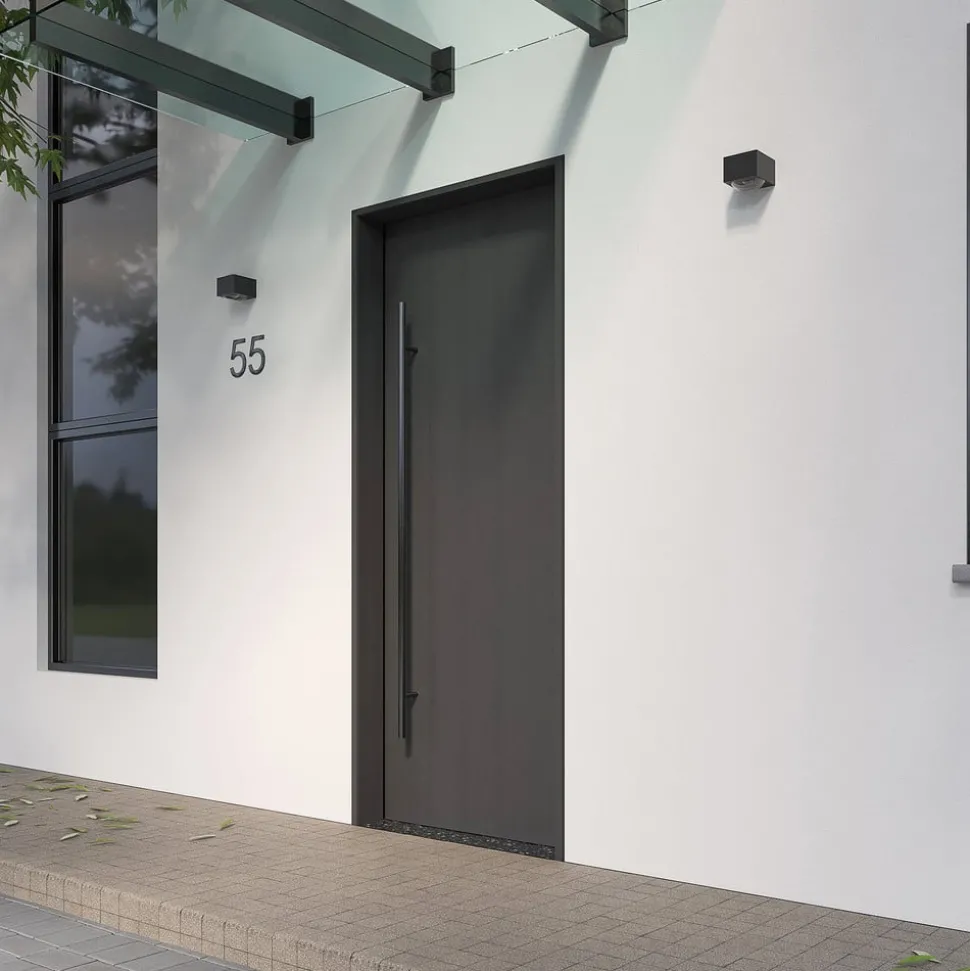 De vast geïnstalleerde LED-module straalt een warm wit licht naar boven en beneden uit en creëert zo prachtige lichteffecten op de huismuur. Almos is een moderne lichtbron die zijn omgeving opfleurt en elegante accenten aanbrengt. Met IP65-bescherming kan hij zonder aarzeling en voor lange tijd buiten worden gebruikt.