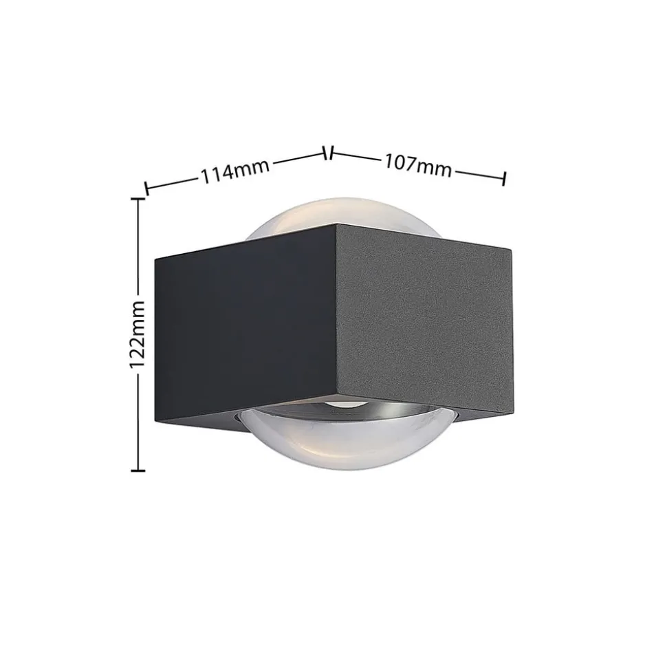 De LED-buitenwandlamp Almos scoort met haar buitengewone design, dat zeker de moeite waard is om te zien. De twee kapjes zijn van glas en halfrond, wat de hoekige behuizing van de armatuur wat afrondt en deze bijzondere look wat meer lichtheid geeft.