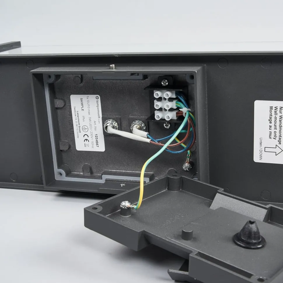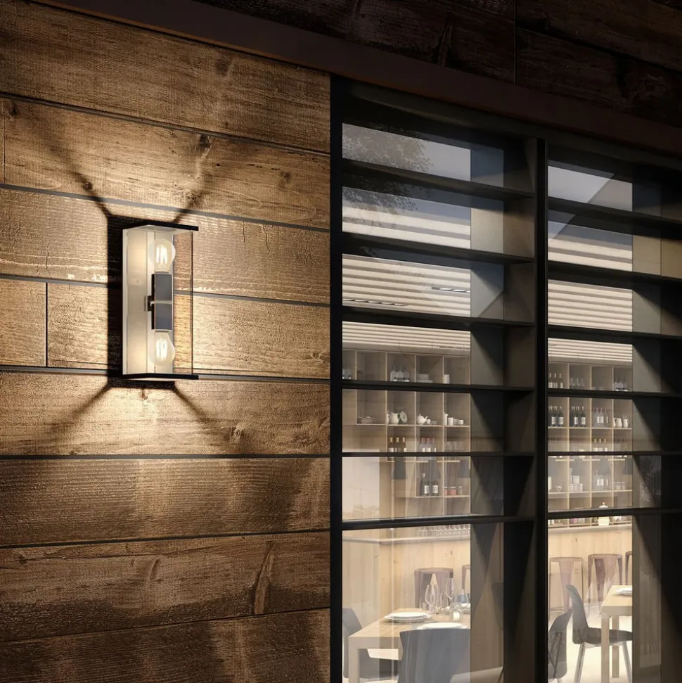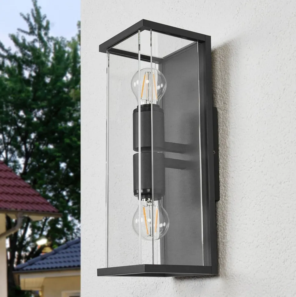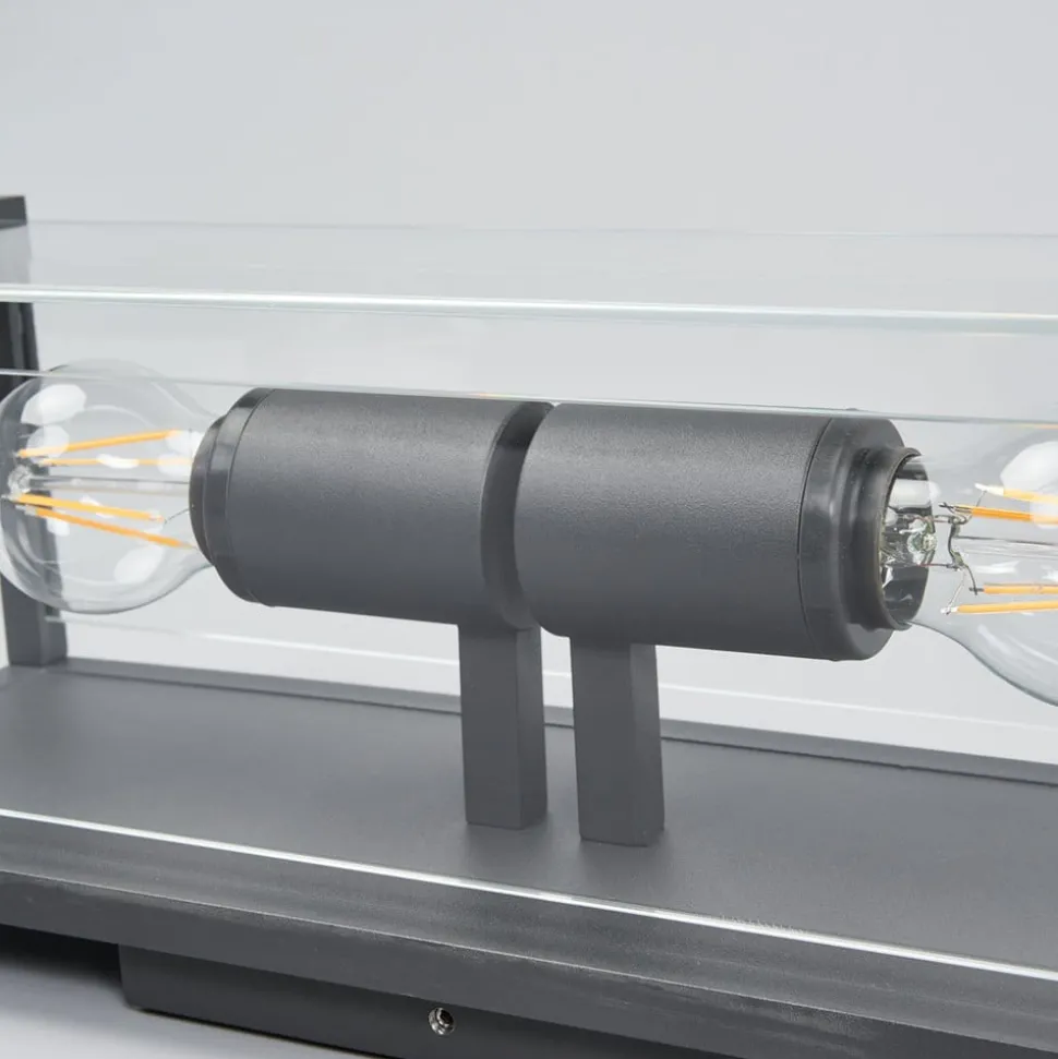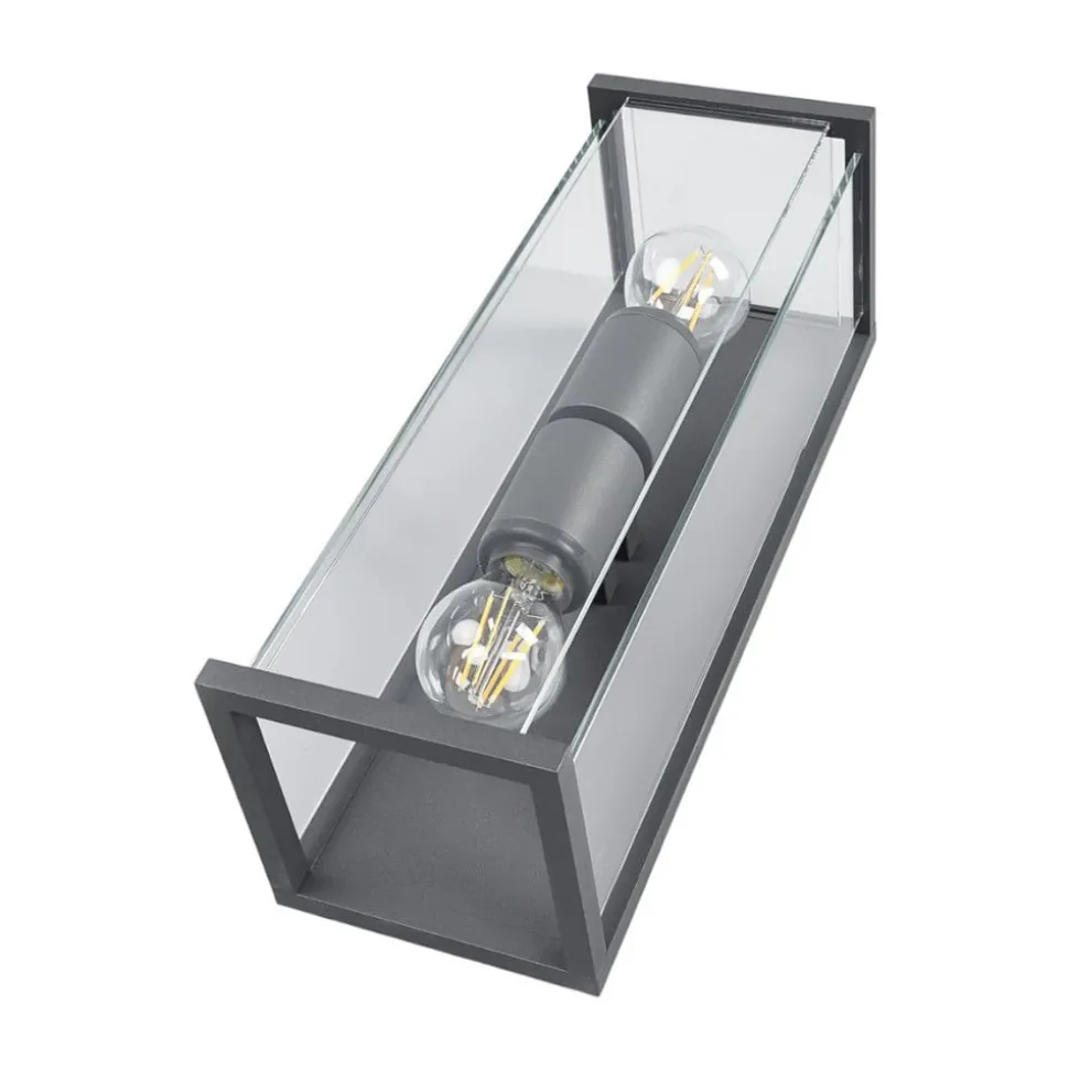 Annalea hoekige buitenwandlamp met glazen inzetstukken en donkergrijs frame Annalea is een zeer modern ogend verlichtingsobject dat buiten gebruikt moet worden. De buitenwandlamp wordt hier gepresenteerd in een 2-lamps versie, waarbij de ene lamp naar beneden gericht is en de andere naar boven. Door het gebruik van heldere glazen inzetstukken is er direct zicht op de gebruikte lampen, die A60-vormig moeten zijn. Het is daarom de moeite waard om bijzondere aandacht te besteden aan de keuze van de lampen om een stijlvol totaalbeeld te creëren.