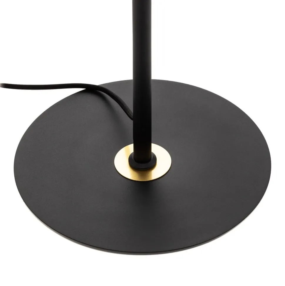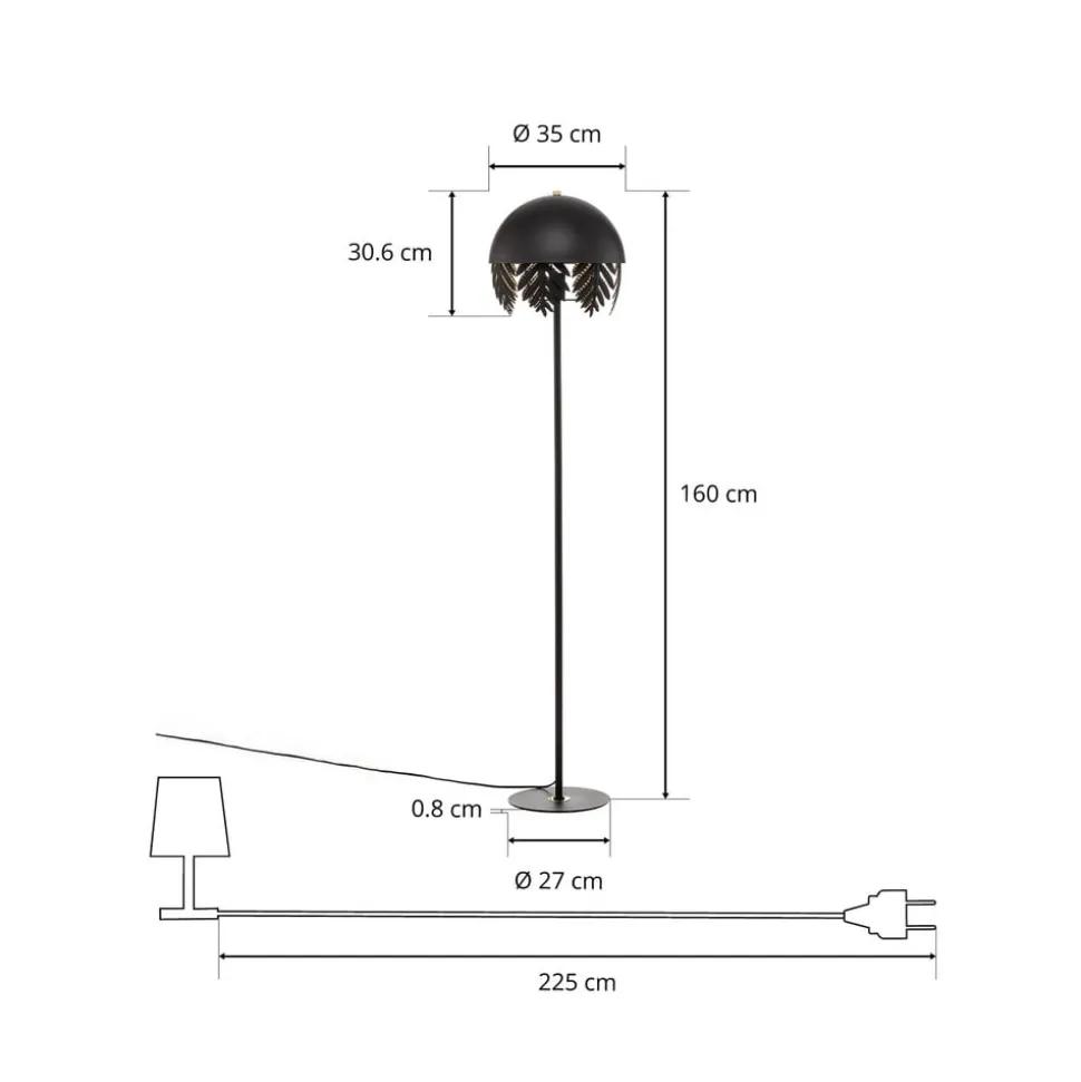 Extravagante Aparas vloerlamp met halfronde metalen kap en bladdecoratie Deze vloerlamp is een echte blikvanger in de woonkamer. Hij is volledig gemaakt van ijzer en is een lichtbron die overal zwart gekleurd is, waarbij alleen de binnenkant van de lamp goudkleurig schijnt, wat niet alleen het uiterlijk van de lamp verfijnt, maar ook het licht warm en gezellig doet lijken. Bovenaan zit een tijdloze, halfronde kap, zodat het licht per se naar beneden wordt gericht. Decoratieve elementen in de vorm van een blad zetten de kap naar beneden door en verminderen de schittering van het licht nog meer, waardoor de lamp absoluut overtuigt op het gebied van gezelligheid en een zeer individuele uitstraling krijgt. De schakelaar bevindt zich in de voedingskabel en de kabel is bekleed met textiel.