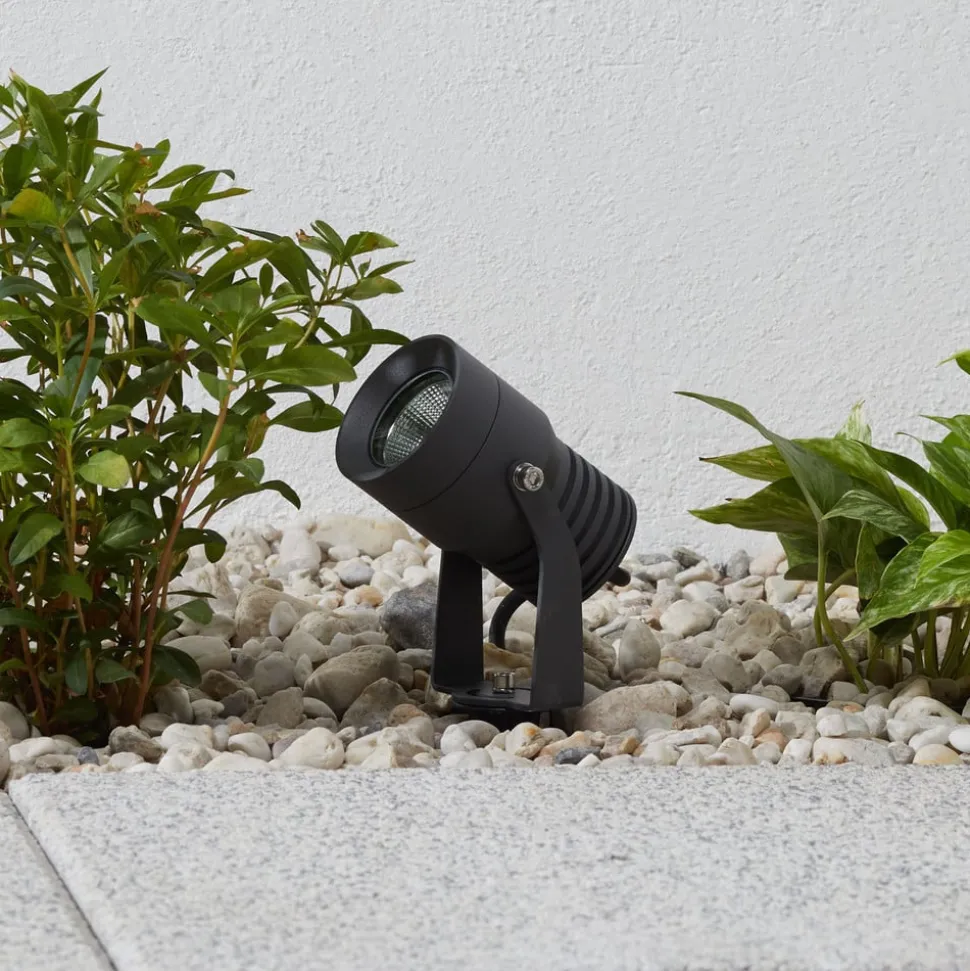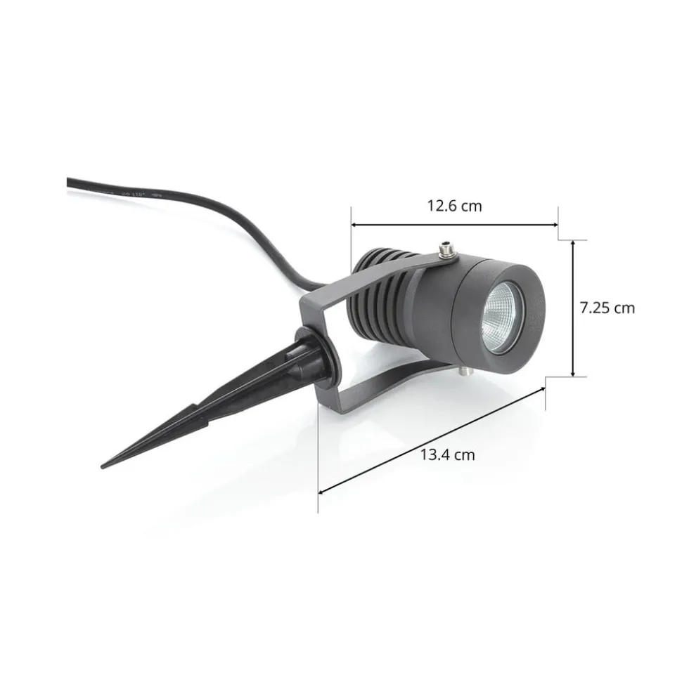 Flexibele LED buitenspot Jon in donkergrijs met beschermingsgraad IP65 De LED buitenspot Jon werpt het licht precies waar het nodig is. Dit maakt de buitenlamp tot een flexibele en veelzijdige verlichtingsoplossing voor buiten, die ook indruk maakt door zijn moderne design. De spot heeft een beweegbare lampenkop en kan daarom gemakkelijk worden aangepast aan de omstandigheden ter plaatse. De kop van de buitenlamp lijkt op een cameralens en is bevestigd aan twee staven die eindigen in de beugel. De donkergrijze gegoten aluminium bekleding is zeer duurzaam en geeft de lamp een strak design. De spot is ook geschikt voor gebruik in tuinperken dankzij de grondspies. De lamp wordt geleverd met een praktische aansluitkabel van 3 meter. Dankzij de beschermingsgraad is de lamp ook goed beschermd tegen regen en vocht. Slagvastheid IK08.