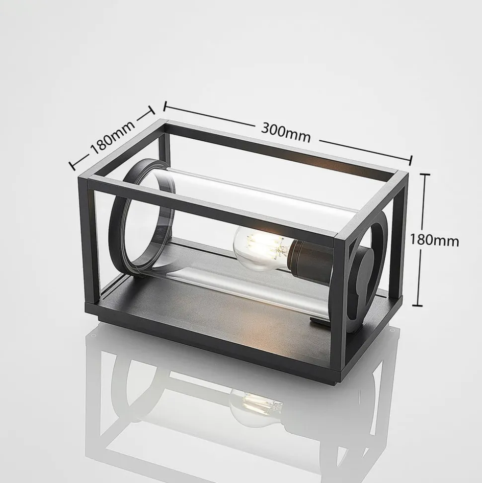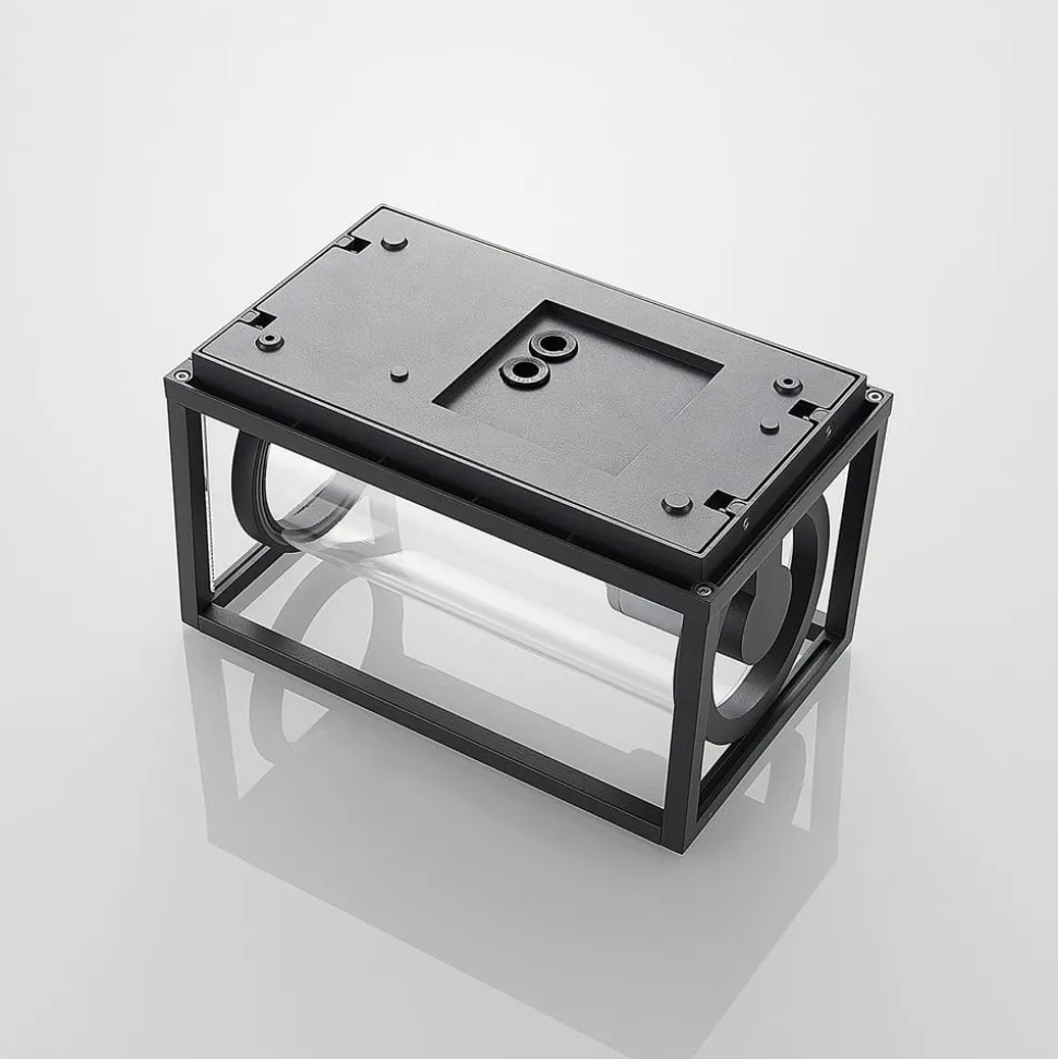 Rechthoekige Brienne buitenwandlamp van aluminium en glas De Brienne buitenwandlamp bestaat uit twee componenten. De buitenste component is een rechthoekige behuizing van aluminium in een donkergrijze kleur. Het tweede onderdeel is een glazen cilinder in de behuizing. De cilinder beschermt de lamp tegen alle weersomstandigheden en rondt tegelijkertijd het ontwerp van het armatuur af. Tot de geschikte lichtbronnen behoren decoratieve filament lampen, die het moderne uiterlijk van de armatuur benadrukken – voor A60 lichtbronnen