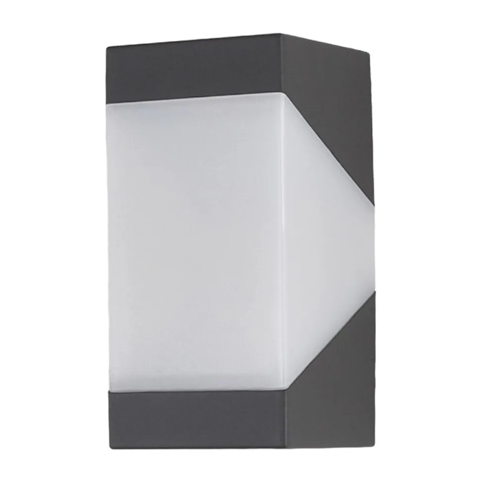 Kiran aluminium buitenwandlamp met driehoekige uitsparing aan de zijkant De Kiran aluminium buitenwandlamp heeft een zeer lineair ontwerp, waarbij het hele armatuur de vorm van een kubus heeft. Het frame is gemaakt van aluminium en de ingebouwde diffuser is gemaakt van polycarbonaat. Het zijelement is bijzonder opvallend, omdat de twee delen elkaar aanvullen in een driehoekige of – als je precies wilt zijn – trapeziumvormige vorm. – RAL 840-M