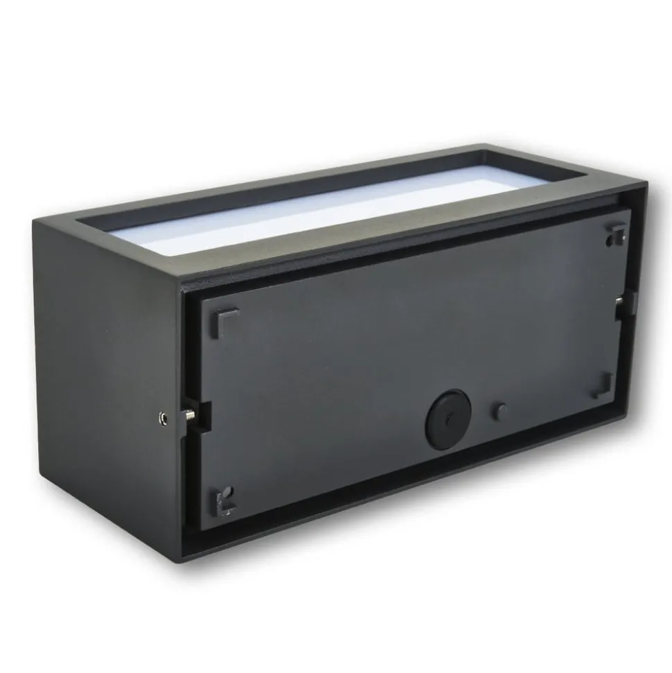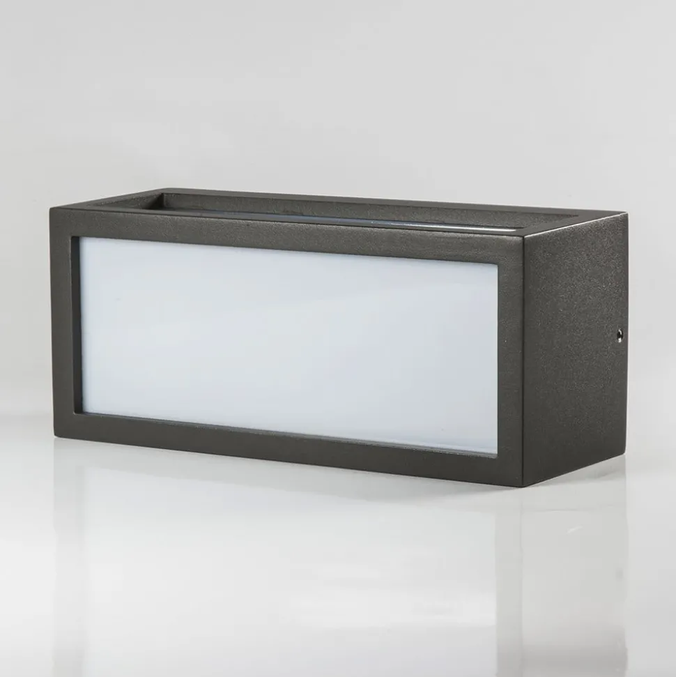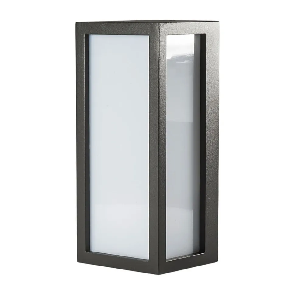 Rechthoekige Tame buitenwandlamp met driezijdige lichtuitstraling en robuuste polycarbonaat inzetstukken Deze buitenwandlamp met beschermingsgraad IP54 geeft niet alleen mooi en gelijkmatig licht dankzij de opaalwitte inzetstukken, maar heeft met zijn grafietgrijze frame ook een discreet stijlvolle en moderne uitstraling, zodat er mooie accenten mee kunnen worden gezet op de gevel van een huis of een andere vorm van metselwerk. Het feit dat de inzetstukken gemaakt zijn van robuust polycarbonaat is een groot voordeel, omdat het veel minder breekbaar is dan glas en een armatuur buiten wordt blootgesteld aan weer en wind, die weinig effect hebben op dit materiaal. De buitenwandlamp is uitgerust met een E27 spaarlamp tot 18 W, zodat het stroomverbruik laag kan worden gehouden.