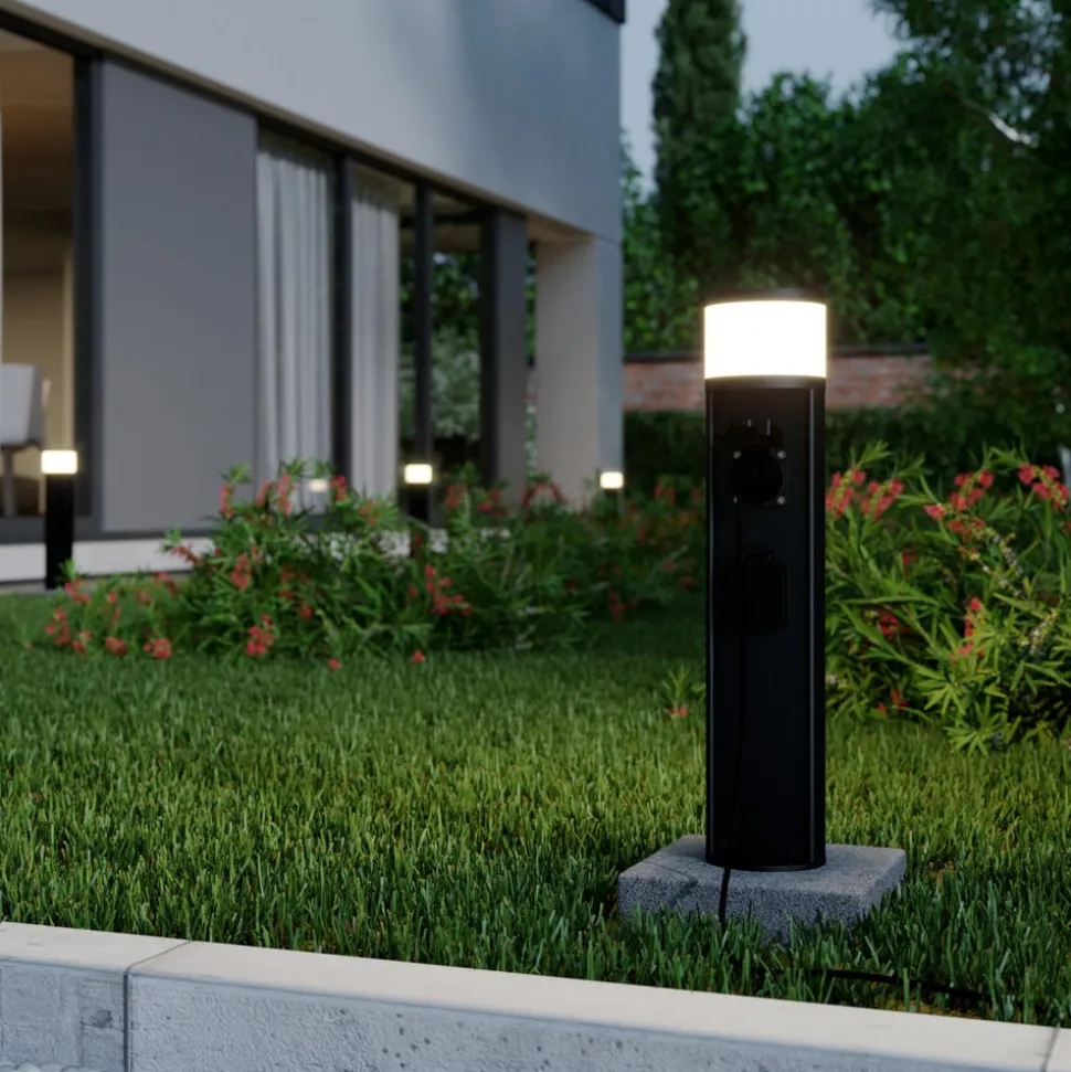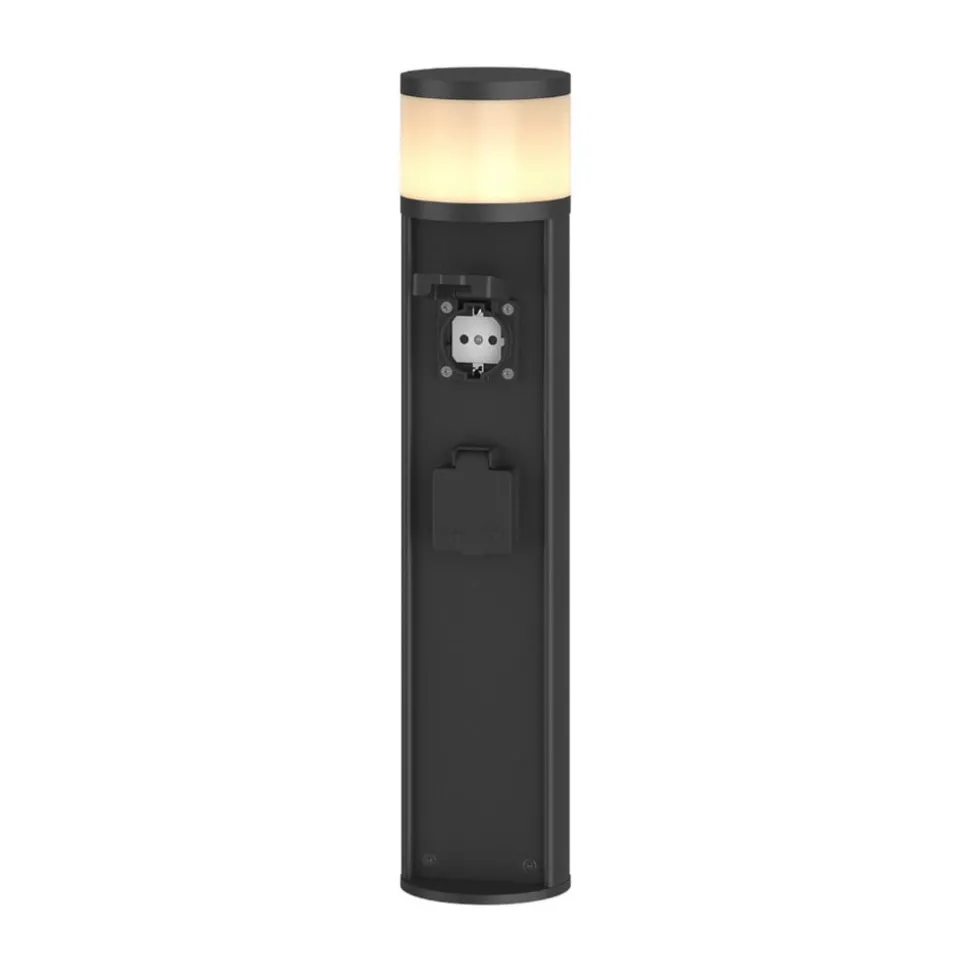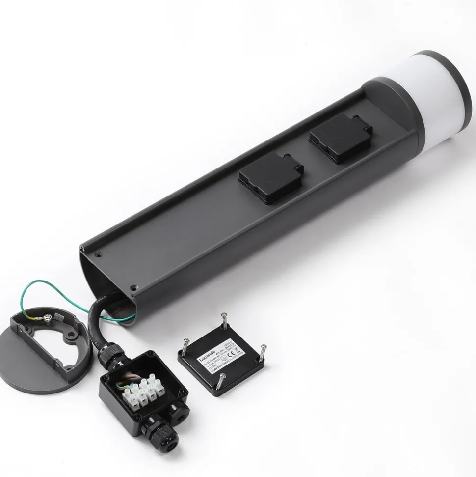 Sokkellamp Corban – verlichting en voeding voor buiten De sokkellamp Corban heeft een eenvoudig ontwerp waardoor de lamp een visueel ingetogen verlichtingsaccent vormt in buitenruimtes. Bovendien zijn er twee stopcontacten in de aluminium behuizing ingebouwd, die geschikt zijn voor een maximaal totaal vermogen van 3.680 watt. Corban zorgt zo voor een stroomvoorziening in de buitenruimte en zet tegelijkertijd bloemperken, paden of patio’s in het juiste licht.