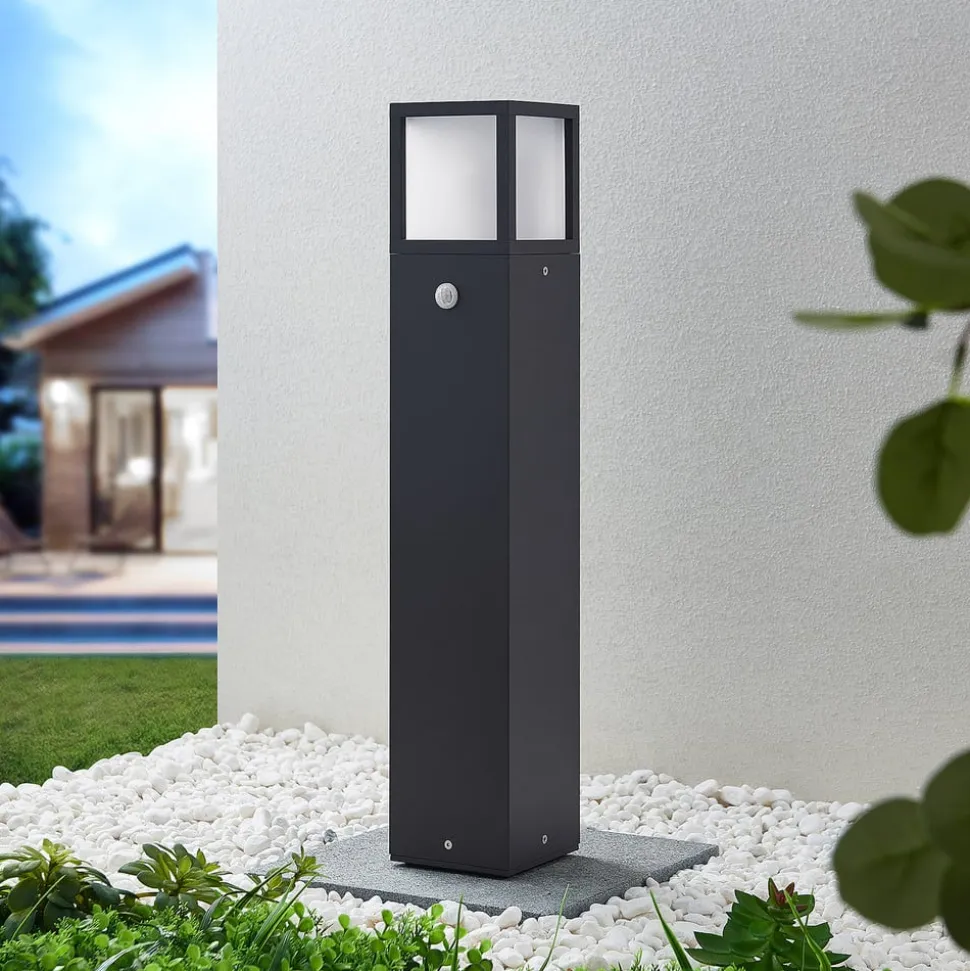 Dewari tuinpadverlichting uitgerust met een sensor in een donkergrijs design De Dewari tuinpadverlichting maakt indruk met zijn hoekige behuizing van gegoten aluminium met een donkergrijze afwerking. Ze past goed in verschillende omgevingen en ziet er modern en uitnodigend uit. De kap van de lampenkap is gemaakt van kunststof en straalt niet-verblindend licht naar buiten. Dankzij de goede beschermingsgraad en schokbestendigheid kan deze lamp ook lange tijd buiten worden gebruikt. De geïntegreerde bewegingsmelder is uiterst praktisch en zorgt voor efficiënte verlichting, precies wanneer je het nodig hebt. Sensorgegevens: – Bereik tot 8 meter (instelbaar) – Detectiehoek tot 100° – 10 tot 2.000 lux (instelbaar) – Lichtduur instelbaar (5 s, 30 s, 1 min, 3 min, 5 min, 8 min)