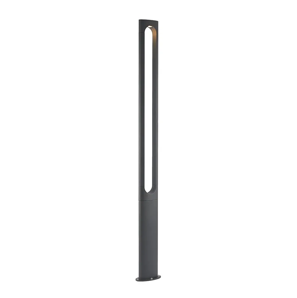 De Dovino LED-mastarmatuur overtuigt door zijn eenvoudige maar zeer opvallende design. Het gegoten aluminium frame steekt rechthoekig uit de vloer en heeft in het midden een grote, lange opening in de vorm van een ovaal.