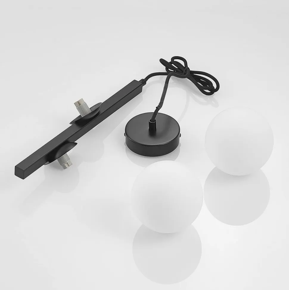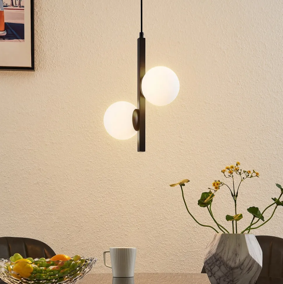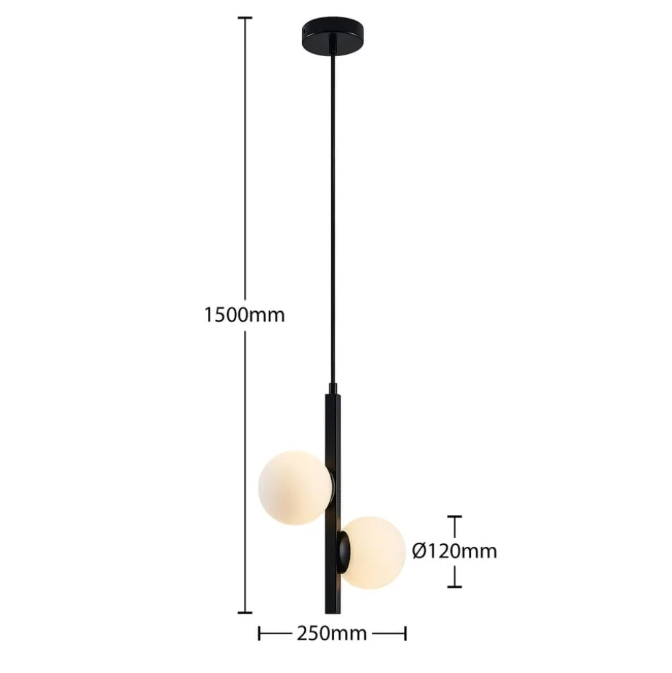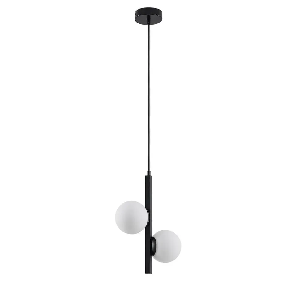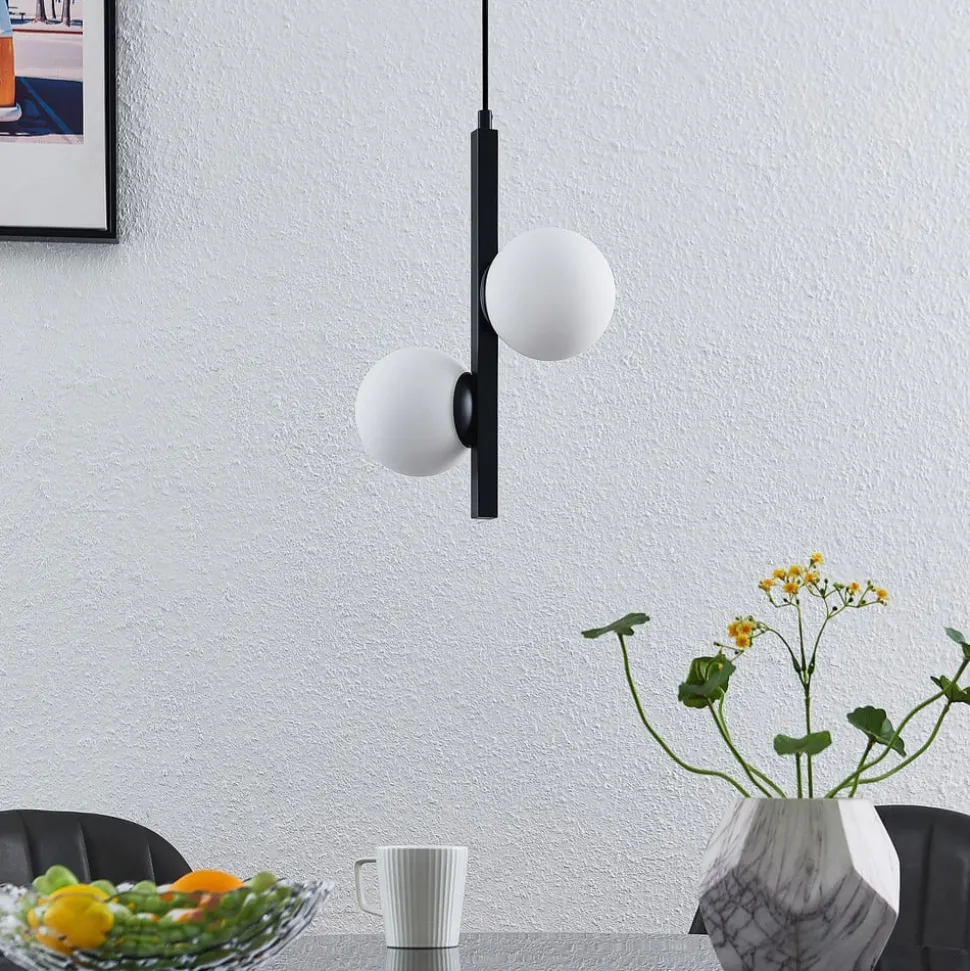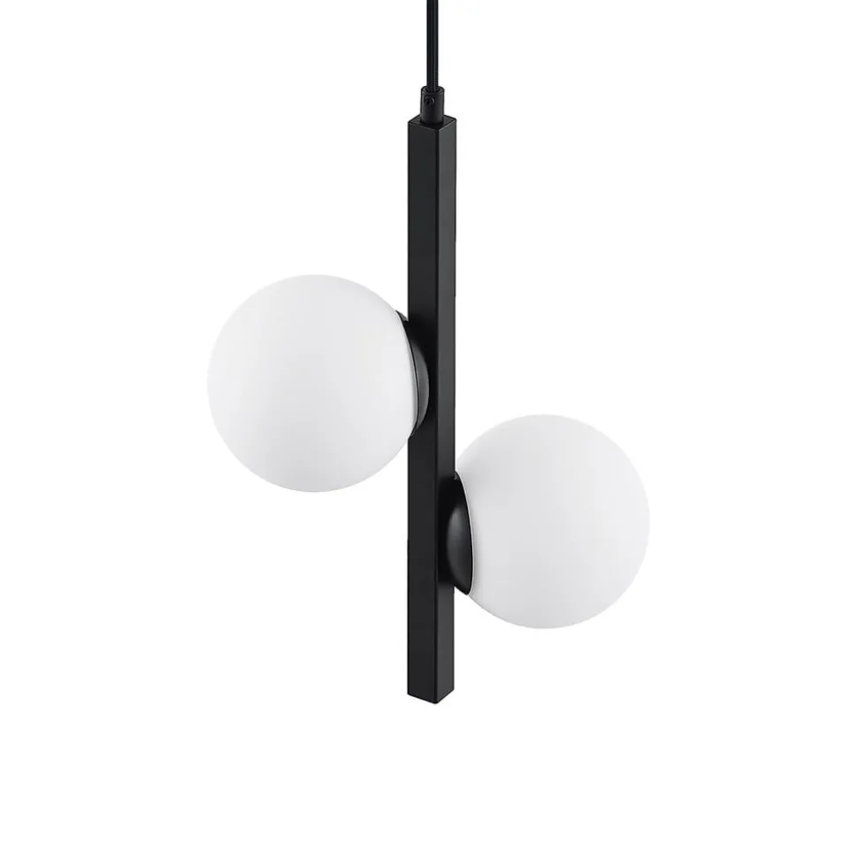 Hanglamp Emarin in klassiek zwart met witte glazen kappen Deze prachtige hanglamp maakt indruk met haar speciale ontwerp. Het frame is gemaakt van ijzer en heeft een zwart oppervlak. De twee kappen zijn ontworpen in de vorm van bollen en zijn gemaakt van opaalwit glas, wat voor een mooi contrast zorgt. De lamp staat net zo goed boven een eetkamertafel als in een lobby of galerie. Het speciale karakter maakt de lamp ideaal voor gebruik in zowel privé- als commerciële omgevingen.