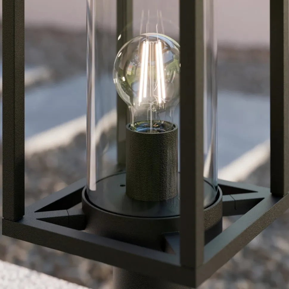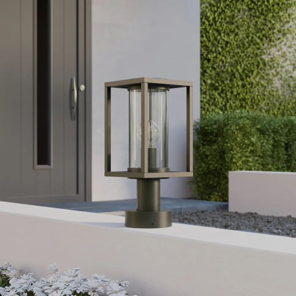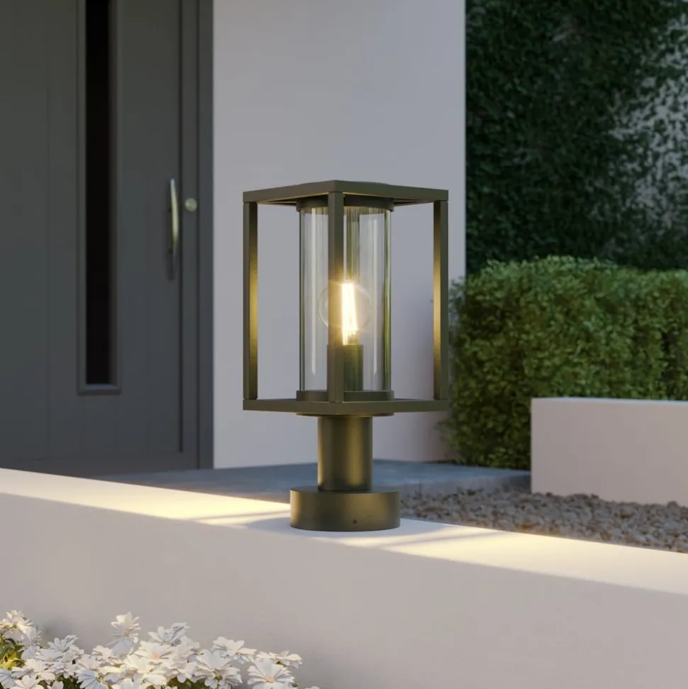 Moderne Ferda sokkellamp voor buiten Antracietkleurig aluminium met een glazen cilinder die de interne lamp beschermt – dit is de moderne Ferda sokkellamp. Het armatuur heeft een modern geometrisch ontwerp en de kap is open. Hierdoor kan het licht ongehinderd in alle richtingen spotten, omdat de beschermende glazen diffuser ook transparant is. Ferda zorgt daarom voor helder, veilig licht, dat ideaal is voor verschillende ruimtes in huis. Dankzij de gebruikte materialen en de robuuste constructie is de Ferda sokkellamp geschikt voor veel verschillende locaties.