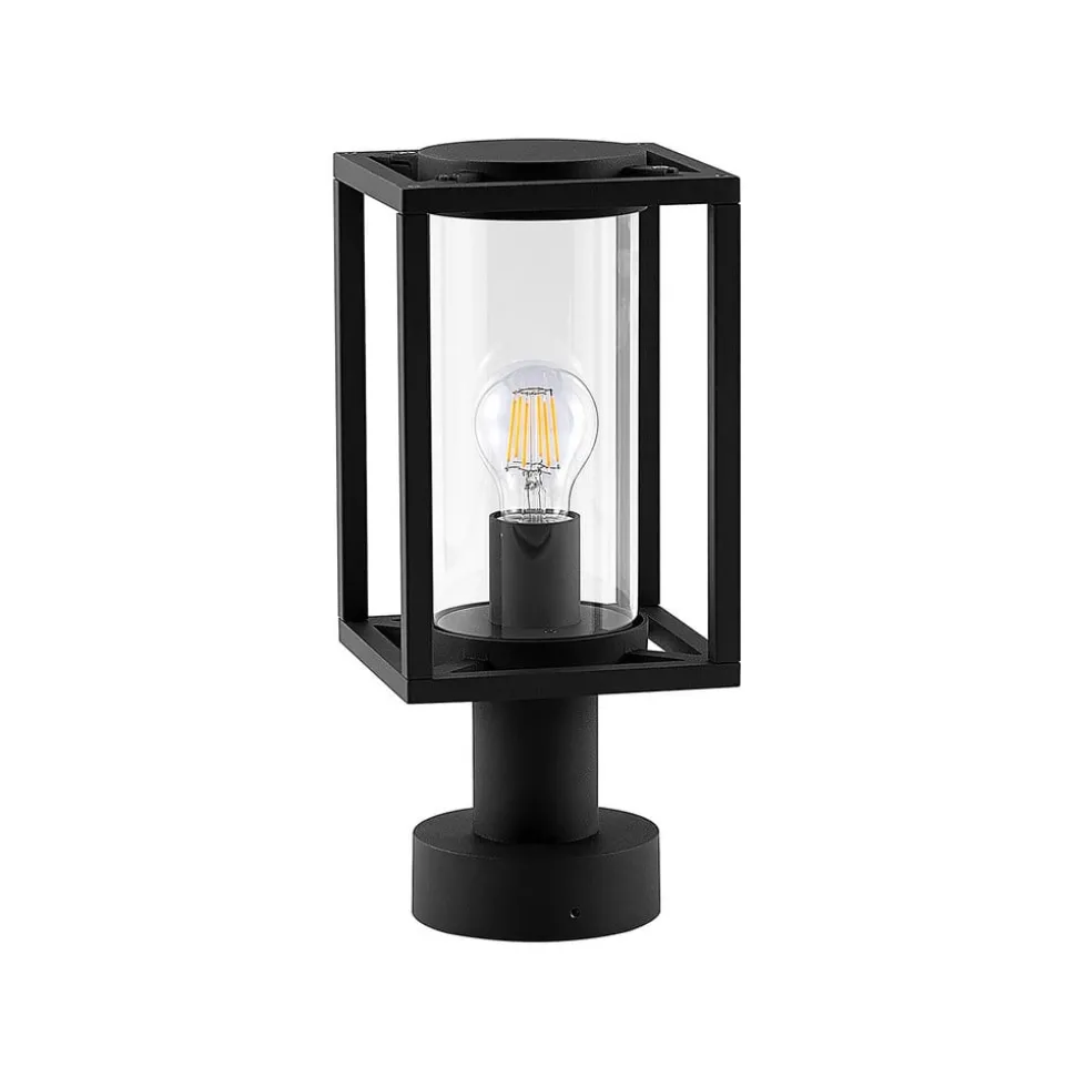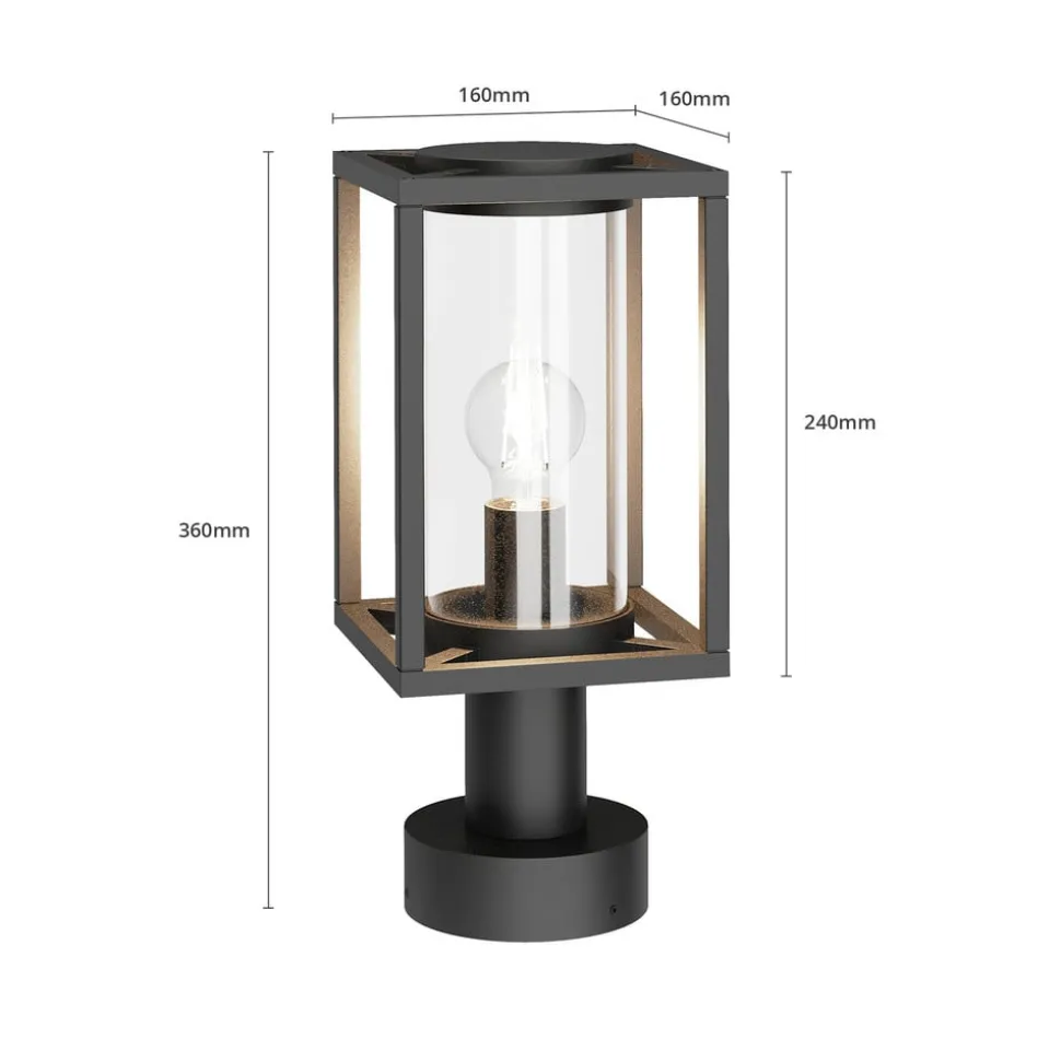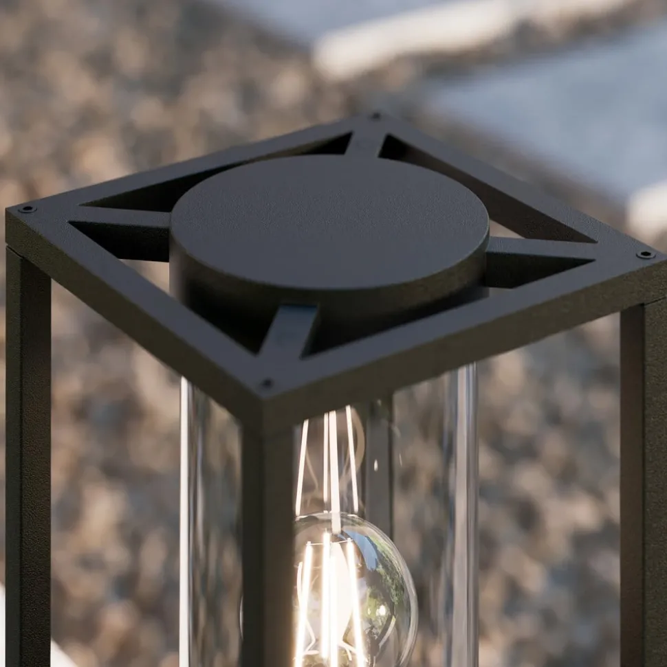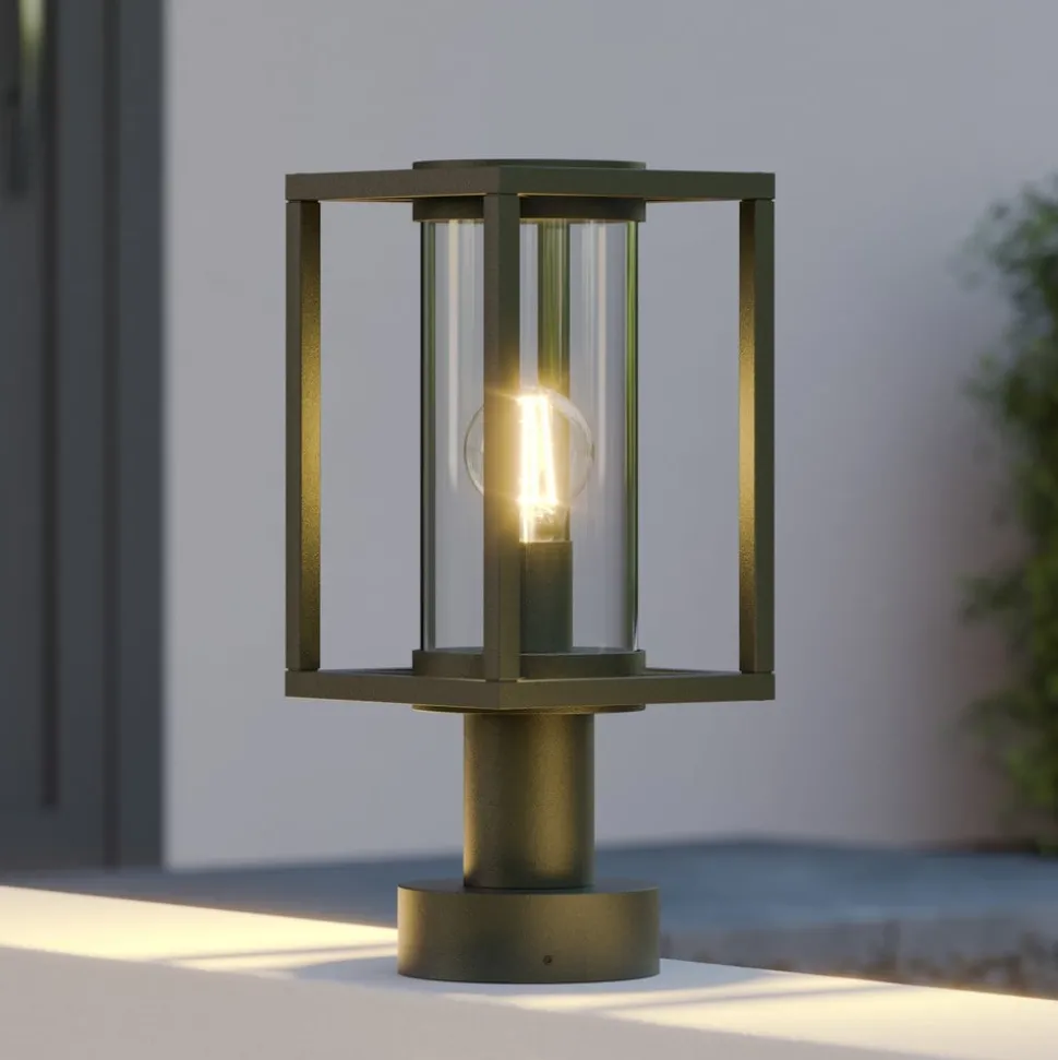 Moderne Ferda sokkellamp voor buiten Antracietkleurig aluminium met een glazen cilinder die de interne lamp beschermt – dit is de moderne Ferda sokkellamp. Het armatuur heeft een modern geometrisch ontwerp en de kap is open. Hierdoor kan het licht ongehinderd in alle richtingen spotten, omdat de beschermende glazen diffuser ook transparant is. Ferda zorgt daarom voor helder, veilig licht, dat ideaal is voor verschillende ruimtes in huis. Dankzij de gebruikte materialen en de robuuste constructie is de Ferda sokkellamp geschikt voor veel verschillende locaties.