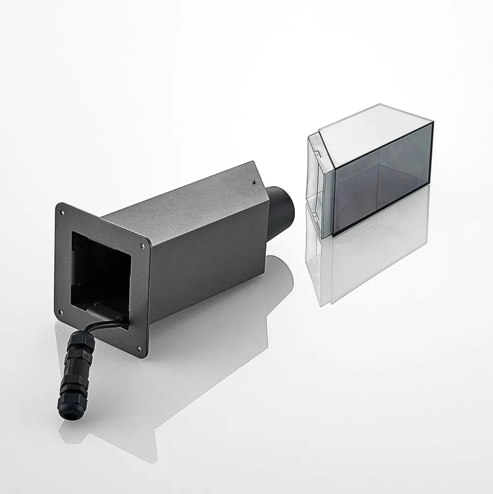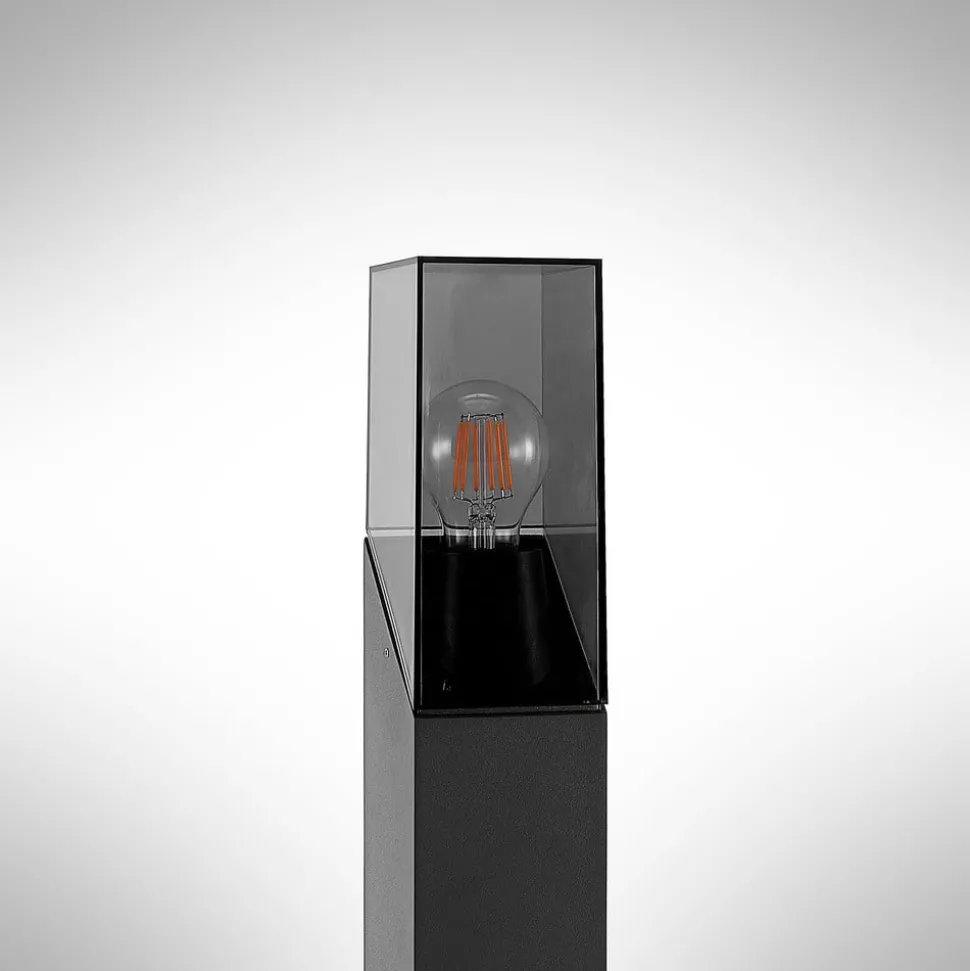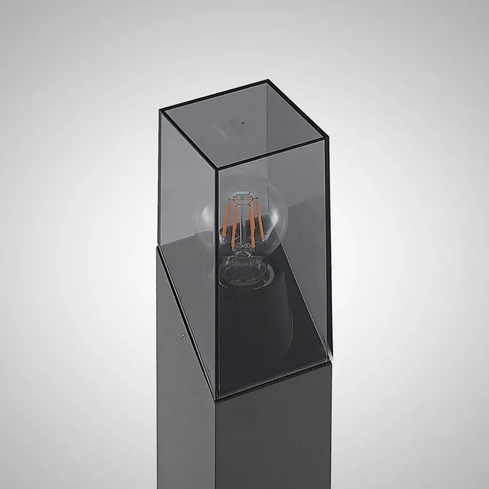 Moderne buitenverlichting – Fiola sokkellamp De geometrische vorm van de Fiola sokkellamp en de speciale kap springen meteen in het oog bij de waarnemer van deze buitenlamp. De sokkellamp bestaat uit een hoekig lichaam van donkergrijs aluminium. De fitting voor de lamp bevindt zich op de afgeschuinde bovenkant, die is omhuld met een transparante, licht rookgrijze kunststof. Idealiter wordt hier een decoratieve gloeidraad of retrofit lamp gebruikt, wat de moderne uitstraling van de Fiola sokkellamp benadrukt.