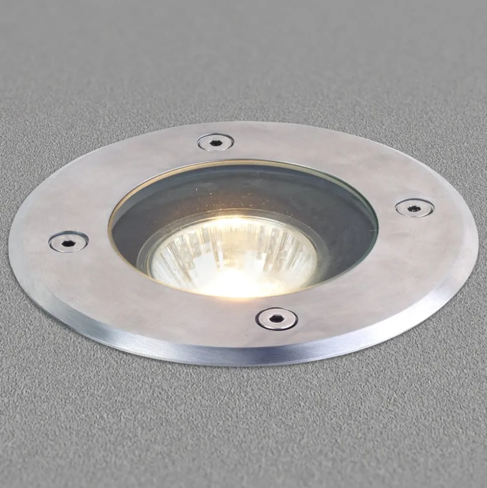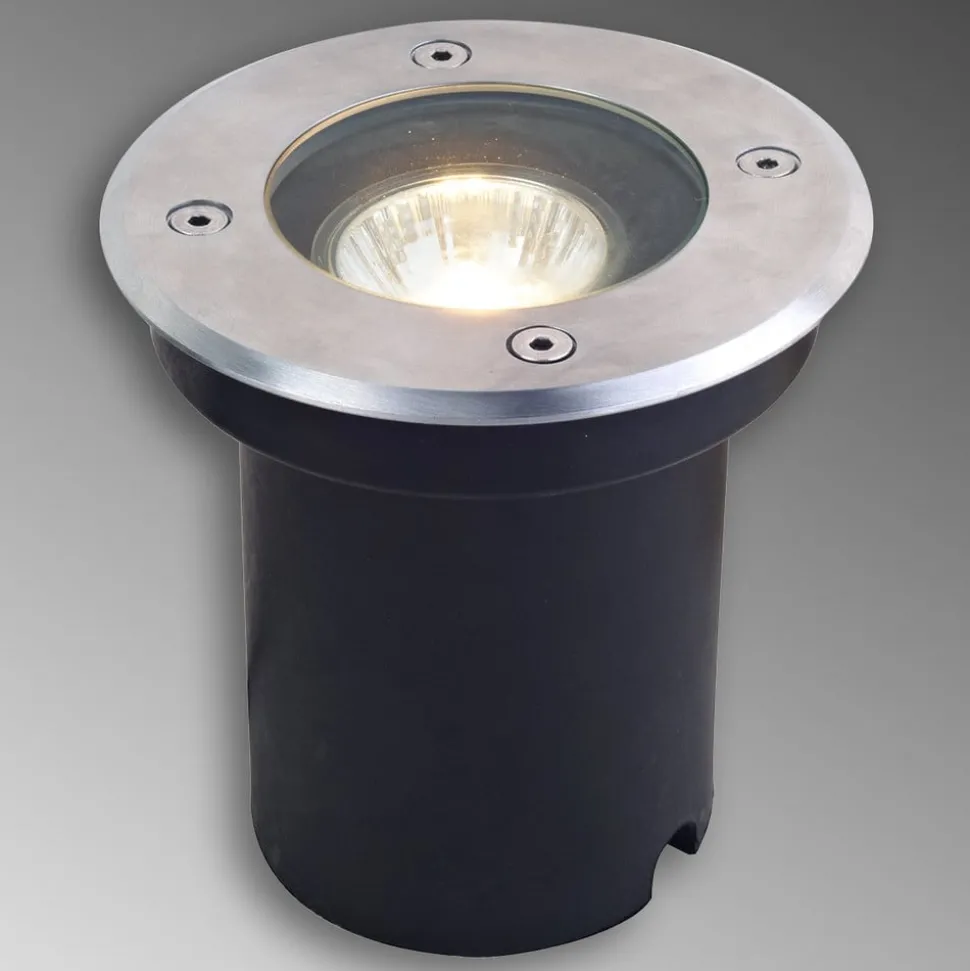 Grondspot inbouwlamp Ava met roestvrijstalen frame, beschermingsgraad IP67 Deze inbouwlamp met beschermingsgraad IP67 biedt de beste bescherming tegen het binnendringen van water en vuil, zodat je ook buiten kunt genieten van functionele en aantrekkelijke verlichting. Er wordt een lamp gebruikt met een GU10 lampvoet van maximaal 35 watt. Het ronde frame rond het beschermende glas is gemaakt van roestvrij staal, waardoor Ava als grondspot inbouwlamp zeer goed past in vele omgevingen. Er wordt een tweede wartel meegeleverd, waardoor het mogelijk is om meerdere armaturen met elkaar te verbinden door middel van doorvoerbedrading. We raden aan om LED lampen uit onze accessoires te gebruiken in deze vloerinbouwlamp. Met halogeenlampen warmt het oppervlak van de glazen schijf op tot hoge temperaturen.