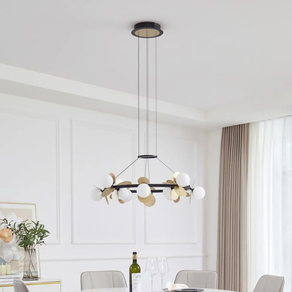 Dimbare hanglamp Pallo LED met 12 glazen bollen De ronde hanglamp Pallo LED is de perfecte keuze voor een moderne eetkamer. Het zwarte en gouden kleurenschema geeft de lamp een geraffineerde touch en maakt er een echte blikvanger van. De 12 lichtbronnen zijn geplaatst in witte glazen bollen, die elk een ronde, gouden afdekking hebben en in een cirkel zijn gemonteerd op een rond, zwart frame. De warmwitte LED’s kunnen in drie fasen worden gedimd met een conventionele wandschakelaar.