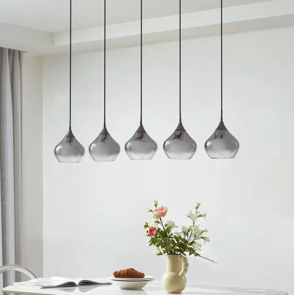 5-lamps Jarven hanglamp van rookgrijs glas en zwart ijzer De Jarven hanglamp, een meesterwerk van modern design, creëert een buitengewone sfeer in elke eet- of woonkamer. De 5-lamps armatuur van fijn glas in rookgrijs zet stijlvolle accenten en creëert een balans tussen esthetiek en functionaliteit. De lamp is niet uitgerust met een dimmer, maar biedt de mogelijkheid om de lichtintensiteit individueel aan te passen via een externe dimmer om de gewenste sfeer te creëren (let op: de externe dimmer moet apart worden aangeschaft).
