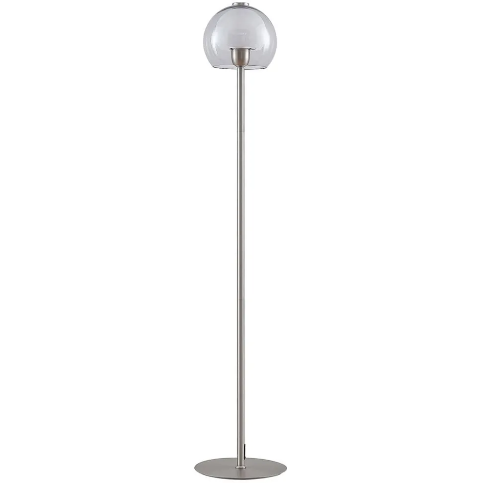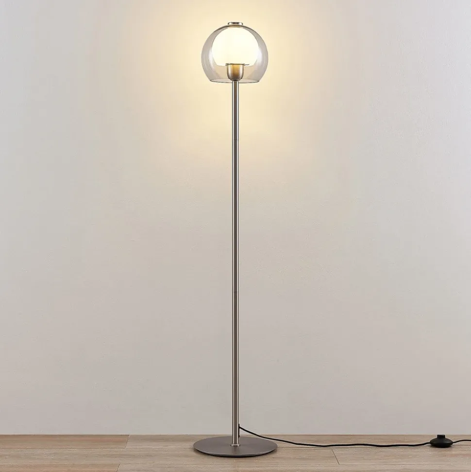 Slanke vloerlamp Kaiya van nikkelkleurig ijzer met glazen kap Kaiya is de perfecte metgezel om ’s avonds op de bank een boek te lezen. De slanke vloerlamp is gemaakt van ijzer en bestaat uit een ronde voet en een slanke poot met een modern nikkelkleurig oppervlak. Bovenop zit een kap die gemaakt is van twee glazen halve bollen en die een aantrekkelijk kleurcontrast creëert met zijn witte en rookgrijze kleurstelling. De vloerlamp Kaiya kan worden voorzien van passende lampen en eenvoudig worden in- en uitgeschakeld met een snoerschakelaar. Het elegante uiterlijk past moeiteloos bij de rest van het meubilair zonder het te overschaduwen.