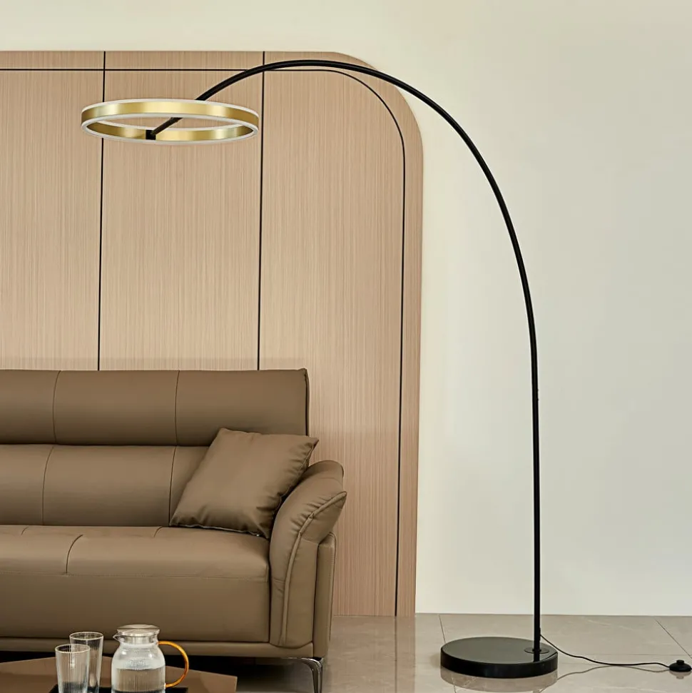 Messingkleurige gebogen LED vloerlamp Yekta in een designgerichte vorm, dimbaar via de voetschakelaar Yekta is een modern en minimalistisch verlichtingsobject voor hedendaagse interieurs, waarbij elke beweging perfect is en je de minimalistische en zorgvuldig overwogen designtaal kunt voelen. De LED boogvormige vloerlamp bestaat uit een ronde voet, een boogvormig frame en een moderne ringvormige kap die zijwaarts gekanteld kan worden met behulp van de scharnieren. De kap heeft een warme messingkleur en verzacht het uiterlijk van de lamp op aangename wijze. Als je de helderheid van het licht wilt aanpassen, heb je alleen de voetschakelaar in de voedingskabel nodig, waarmee de helderheid in drie stappen kan worden gewijzigd. 3-staps dimbaar + uit: de schakelaar maakt het mogelijk om het licht gewoon aan en uit te schakelen. Dankzij de 3-staps dimtechnologie met geïntegreerde uit-functie kan de lamp ook tot drie verschillende helderheidsniveaus worden gedimd door meerdere keren op de schakelaar te drukken: 100%, 50% en 15%.