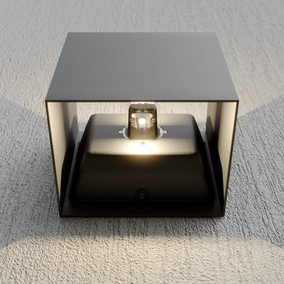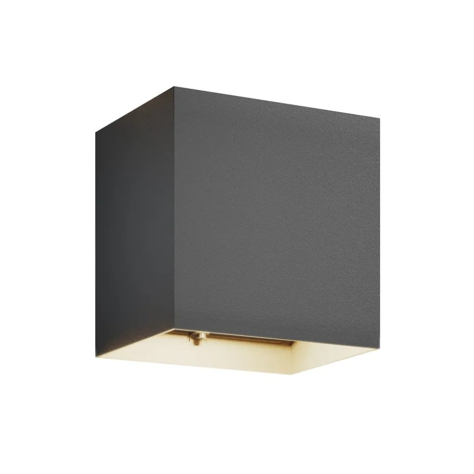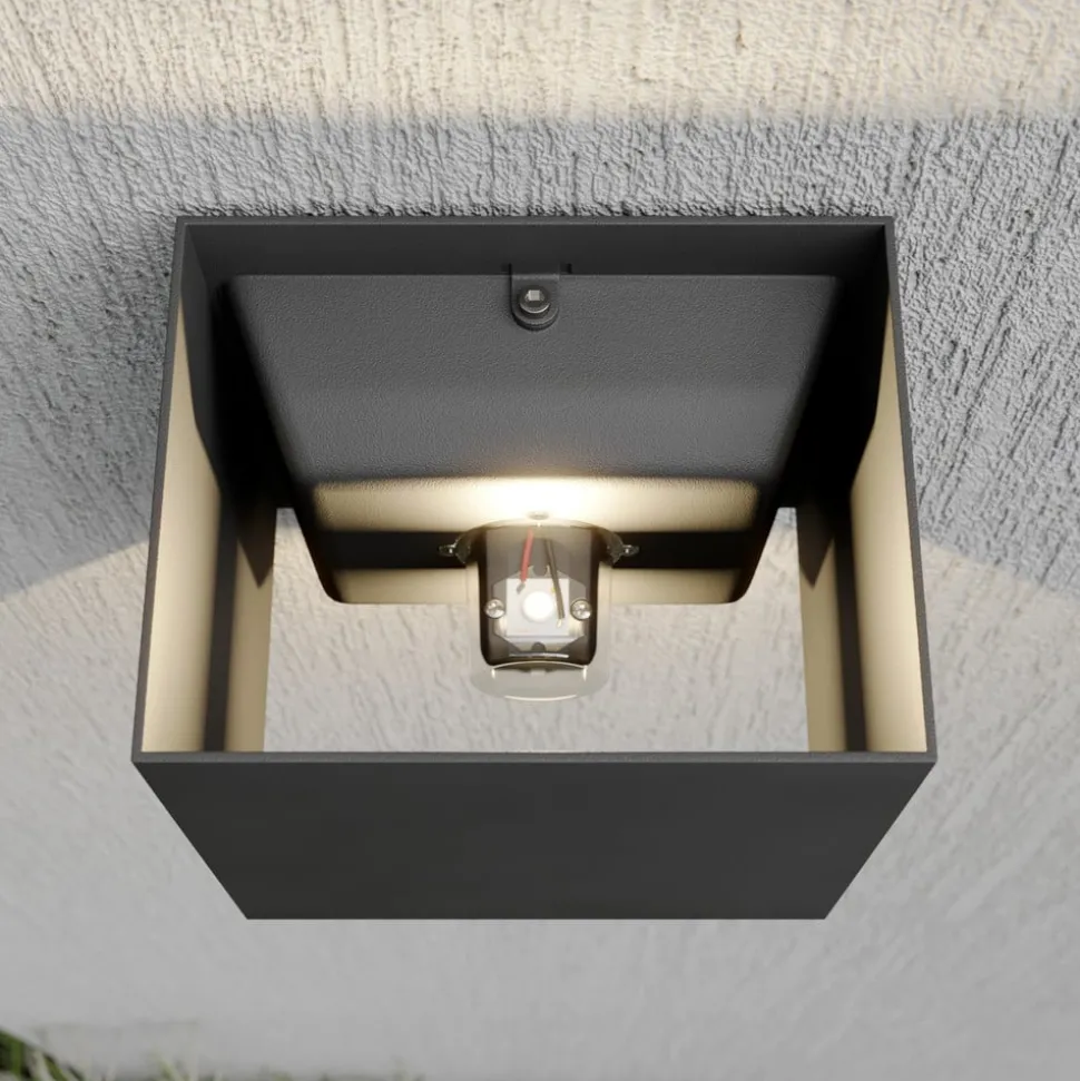 Kubusvormige Evie buitenwandlamp met warmwitte LED’s en dubbele lichtuitstraling Bij de Evie buitenwandlamp is de lichtkegel niet alleen onderaan maar ook bovenaan zichtbaar. Dit creëert een opvallend totaaleffect (meestal al van ver herkenbaar in buitenruimtes) dat doet denken aan een afwisseling van rechte hoeken gevuld met licht en schaduw. Het licht is helder en overtuigt door een goede lichtopbrengst, wat natuurlijk te danken is aan de energiebesparende LED lampen die permanent in het armatuur zijn geïntegreerd.