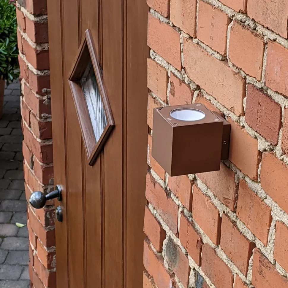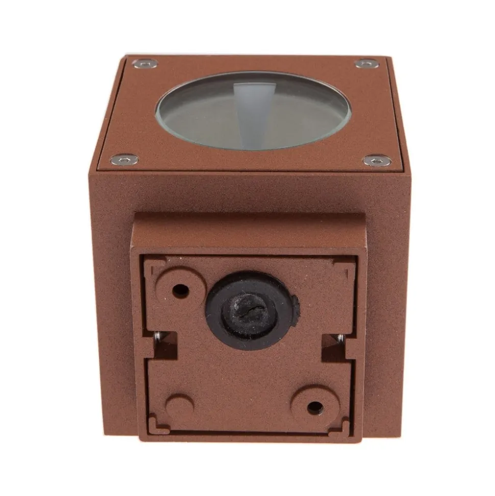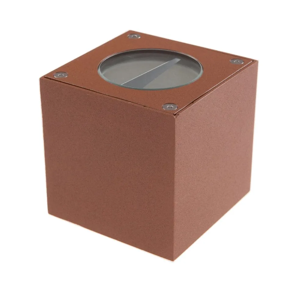 Roestbruine LED buiten wandlamp Jarno met een effectieve lichtstraal In principe kun je niet verkeerd gaan met een kubus als je op zoek bent naar een vorm die tijdloos is en universeel gebruikt kan worden. De behuizing van deze LED buiten wandlamp is gemaakt van roestbruin gelakt metaal. Deze wandlamp is zeer discreet wanneer ze niet is ingeschakeld, maar het bijzondere van deze wandlamp komt pas tot zijn recht wanneer de LED lamp is ingeschakeld. Dan worden de lichtstroken effectief gereflecteerd op de achterliggende muur. Bovenaan is er maar een smalle strip, maar onderaan wordt het warmwit licht in een brede hoek uitgestraald. Het roestbruine oppervlak van de LED wandlamp geeft het een rustiek karakter, zodat het ook goed staat in de omgeving van oudere huizen en landgoederen. Een extra lichtrooster wordt meegeleverd, zodat de volgende lichtpatronen mogelijk zijn voor een ontwerp op maat: – smal bovenaan en breed onderaan – breed bovenaan en onderaan – smal bovenaan en onderaan – breed bovenaan en smal onderaan